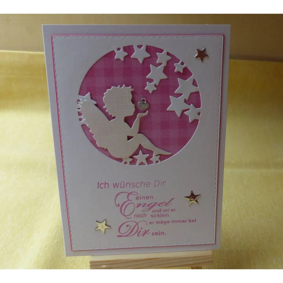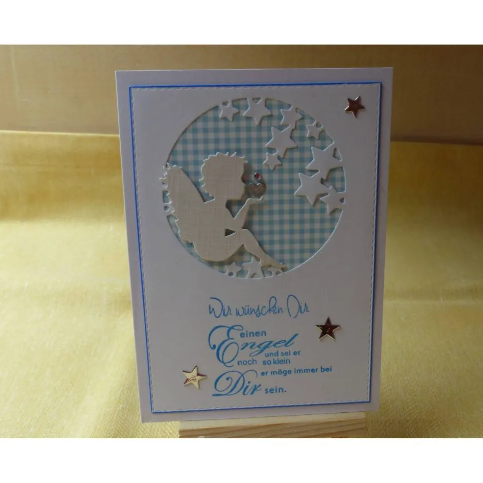 Die harmonische Farbkombination in Blautönen oder Rosatönen verziert mit einem Engel und Sternen auf weißen Untergrund sind ganz bezaubernd.
