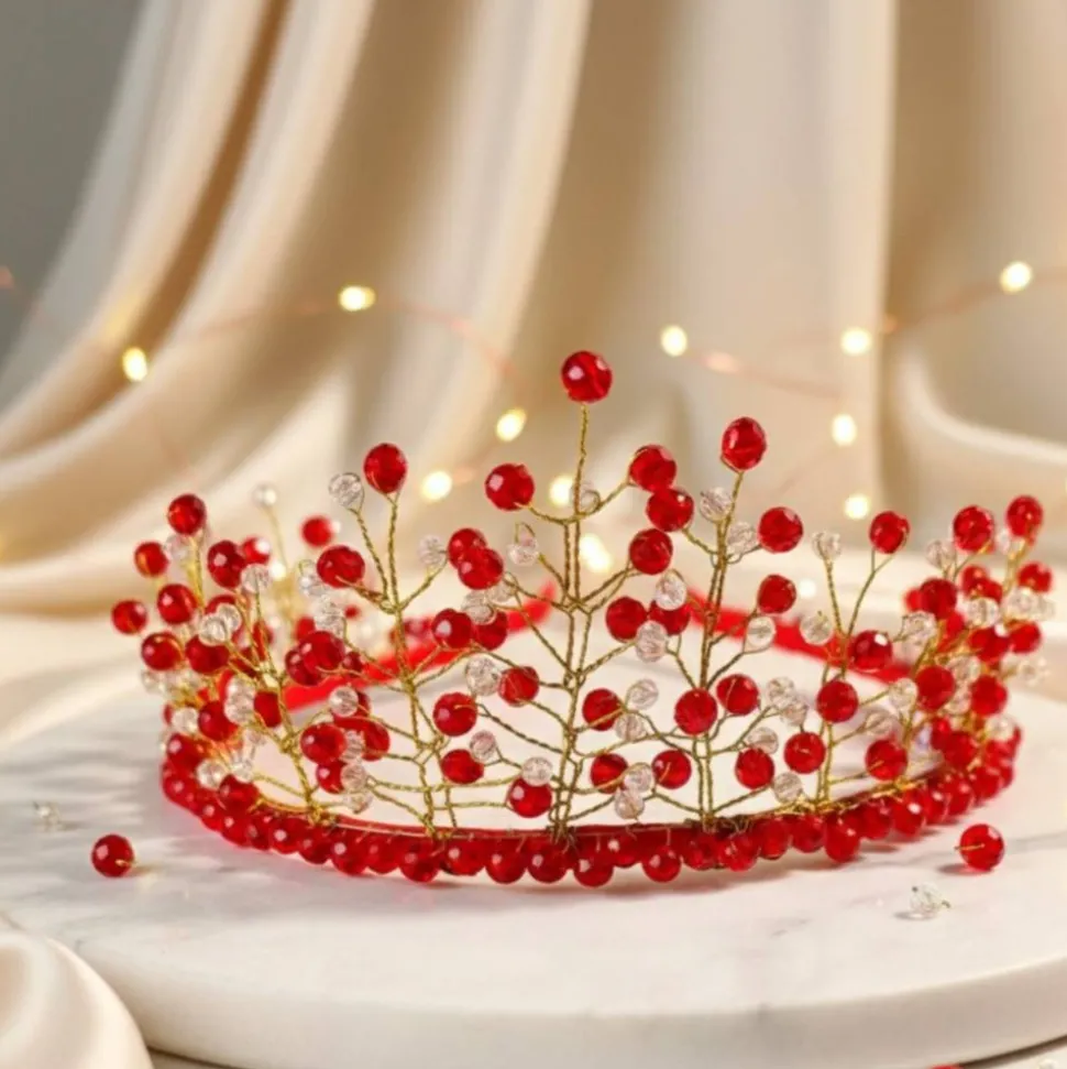 Golden Blossom ist deine außergewöhnliche, handgefertigte Krone – ein Unikat, das Leidenschaft, Stärke und Königinnenenergie verkörpert. Feine goldene Drähte und funkelnde rote Kristallblüten vereinen sich zu einem Schmuckstück, das das Licht magisch bricht und jede Bewegung mit tausend Facetten veredelt.