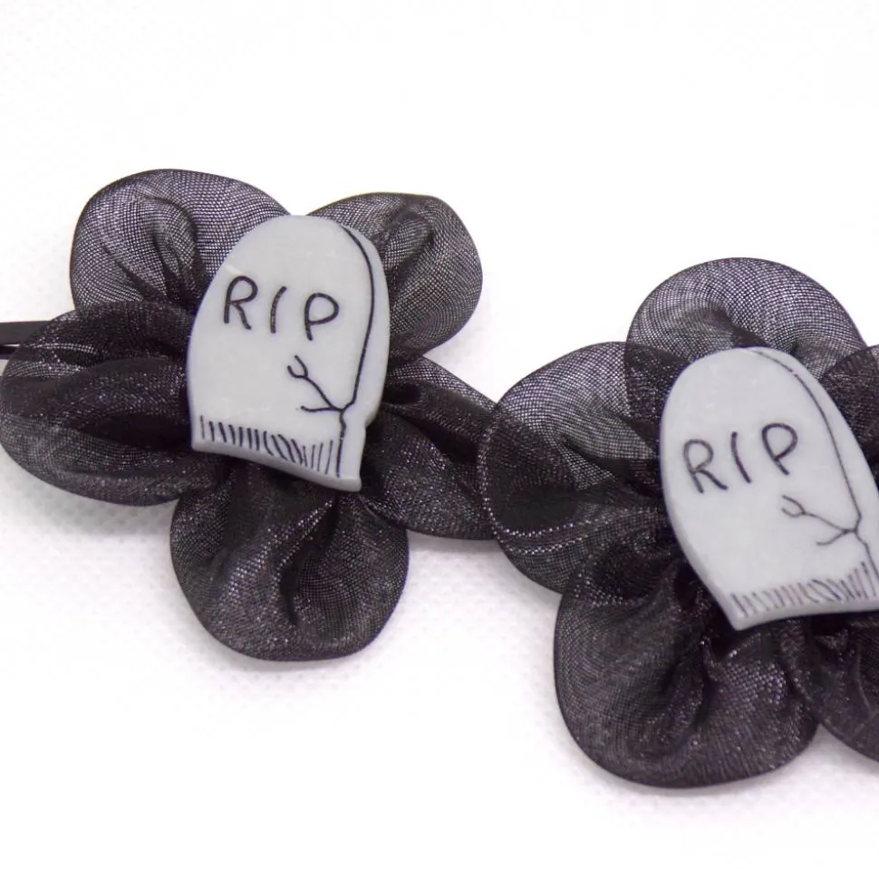 Setze ein Statement mit diesen einzigartigen Haarspangen aus durchsichtig schwarzem Organzastoff und Grabstein-Applikationen! Die Spangen sind echte Hingucker und verleihen deinem Look einen extravaganten Gothic-, Rockabilly- oder Punk-Touch. Beide Haarspangen werden mit einer praktischen Knick-Knack-Spange befestigt und sorgen so für sicheren Halt.
