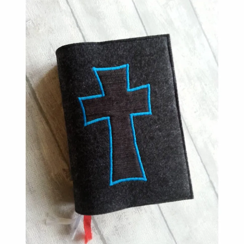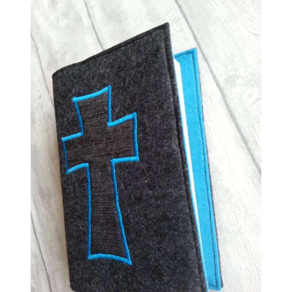 Der Einband ist aus Filz. In dunkelgrau-meliert, vorne ist ein Kreuz in türkis umrandet. Die Innenstreifen sind in türkis.