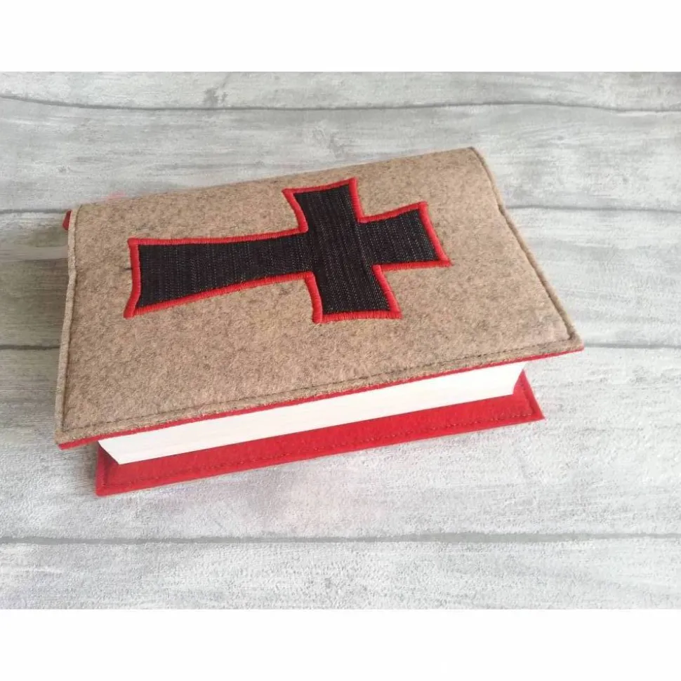 Der Einband ist aus Filz. In hellbraun-meliert, vorne ist ein Kreuz in rot umrandet. Die Innenstreifen sind in rot.