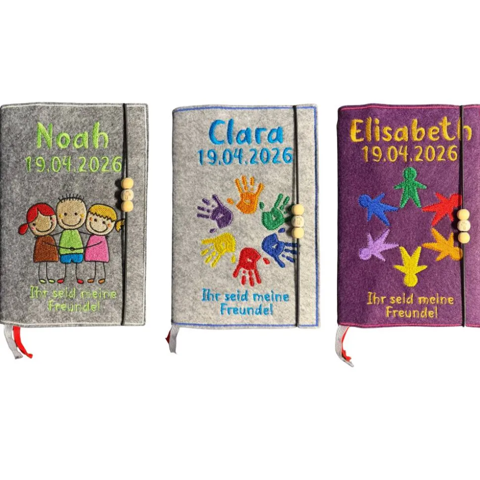 Bei Motiv 15,17 und 19 wird der Text „Ihr seid meine Freunde!“ in der gleichen Stickgarnfarbe gestickt wie der Name und das Datum.