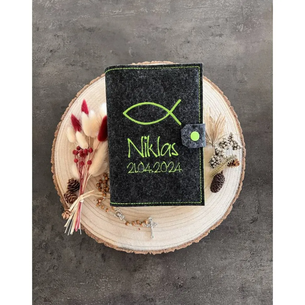 Sie können Ihre Gotteslobhülle ganz individuell zusammenstellen. Wählen aus Filzfarbe, Wunschtext und Druckknopffarbe. So erhalten Sie ihren ganz persönliche Gotteslobhülle!