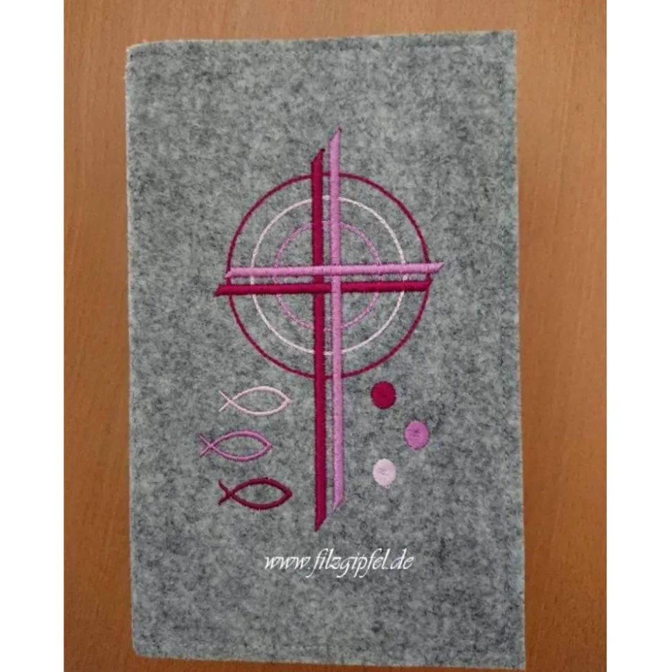 Ein Kreuz mit Kreis, Fischen und kleine Punkten sind auf die Hülle aufgestickt.
