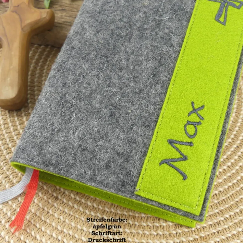 Entdecke die schlichte und dennoch edle Gotteslobhülle/Bibelhülle aus hochwertigem, grauem Filz. Das Besondere an dieser Hülle ist der farbige Kontraststreifen mit eingesticktem Kreuz, der individuell in deiner Wunschfarbe gefertigt wird. Dein persönlicher Name macht die Hülle zu einem einzigartigen Unikat – ein ganz besonderes Geschenk zur Kommunion, Firmung oder Konfirmation.