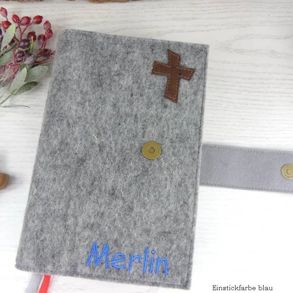 Entdecke die schlichte und zeitlose Gotteslobhülle aus hochwertigem, hellgrauem Filz – das perfekte Geschenk zur Kommunion, Konfirmation oder Firmung. Der aufgesteppte Kreuz-Akzent und der Verschlussriegel aus edlem Korkleder verleihen dem Design das gewisse Etwas und sorgen für stilvolle Einzigartigkeit.