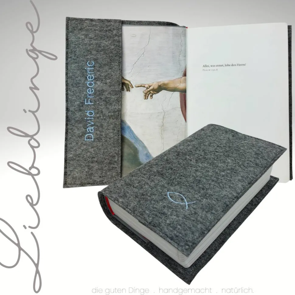 Edel und haltbar bestickt mit einem kleinen Fisch auf dem cover und auf Wunsch mit Deinem Namen.