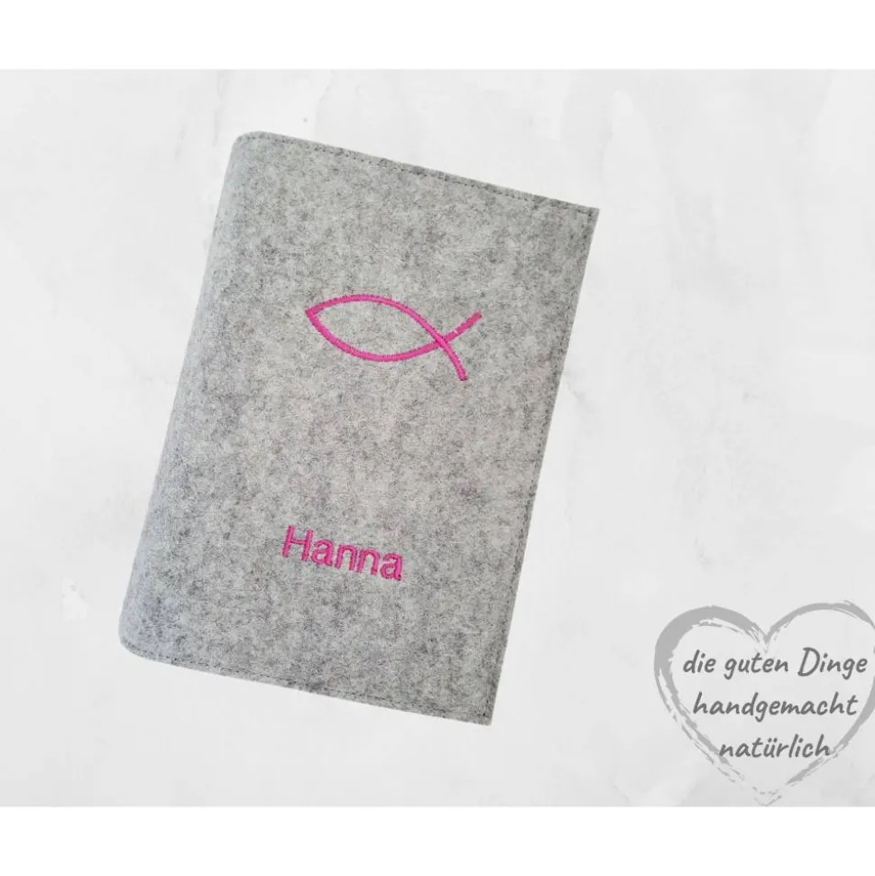 Edel und haltbar bestickt mit dem Ichtys Fisch und Deinem Wunschnamen.