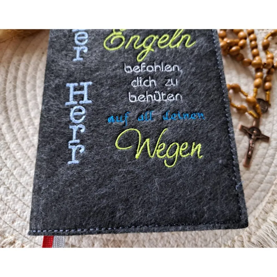 Die Hülle kann individuell mit dem Namen des Kindes und dem Datum der Erstkommunion gestaltet werden, was sie zu einem ganz besonderen Andenken an diesen wichtigen Tag macht. Die Bestickung erfolgt bei diesem Modell auf der Rückseite der Hülle und wird mit modernster Technologie präzise und dauerhaft in den Filz eingestickt.