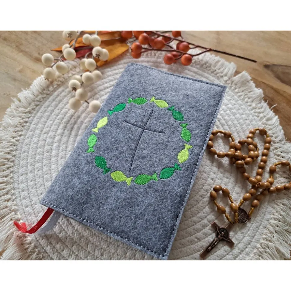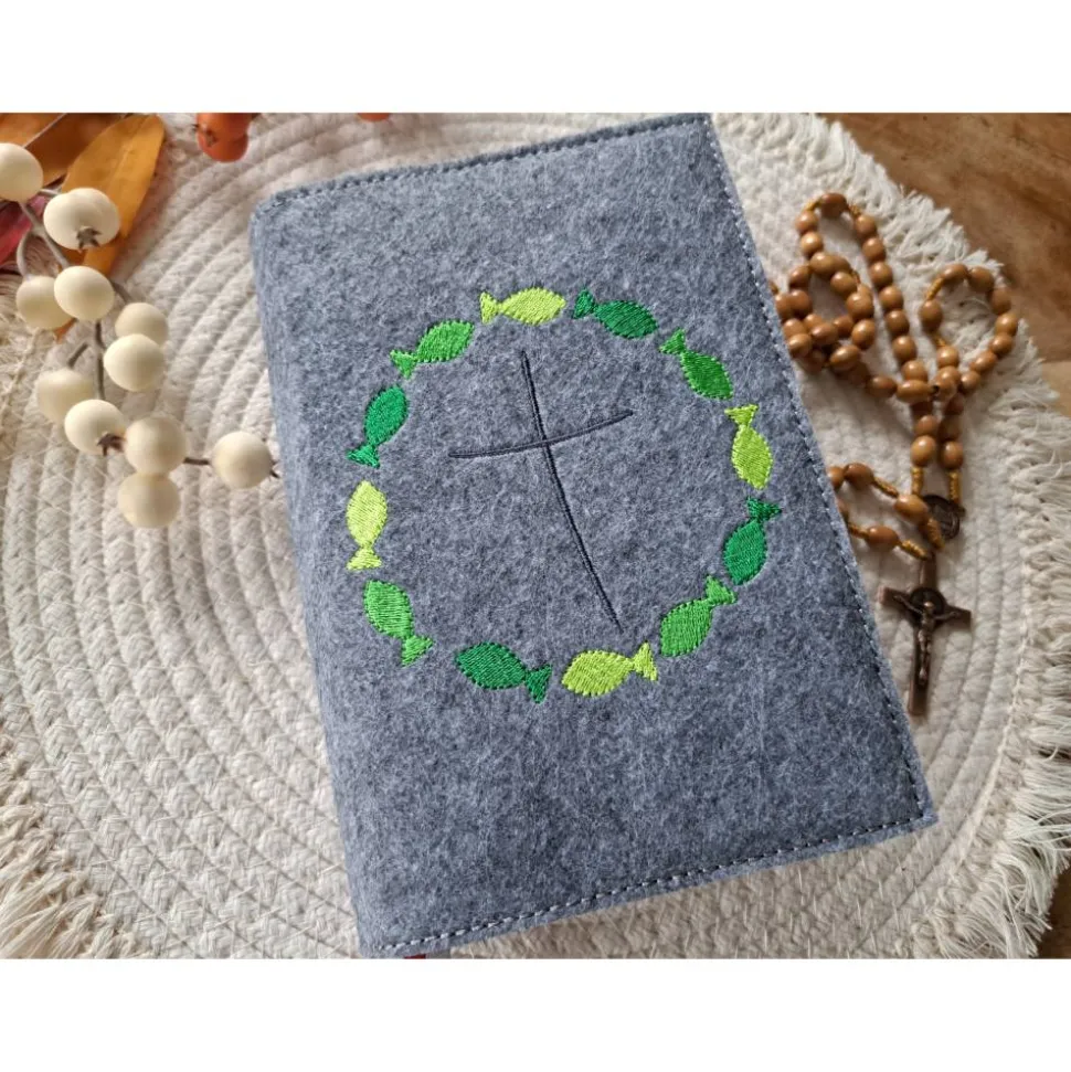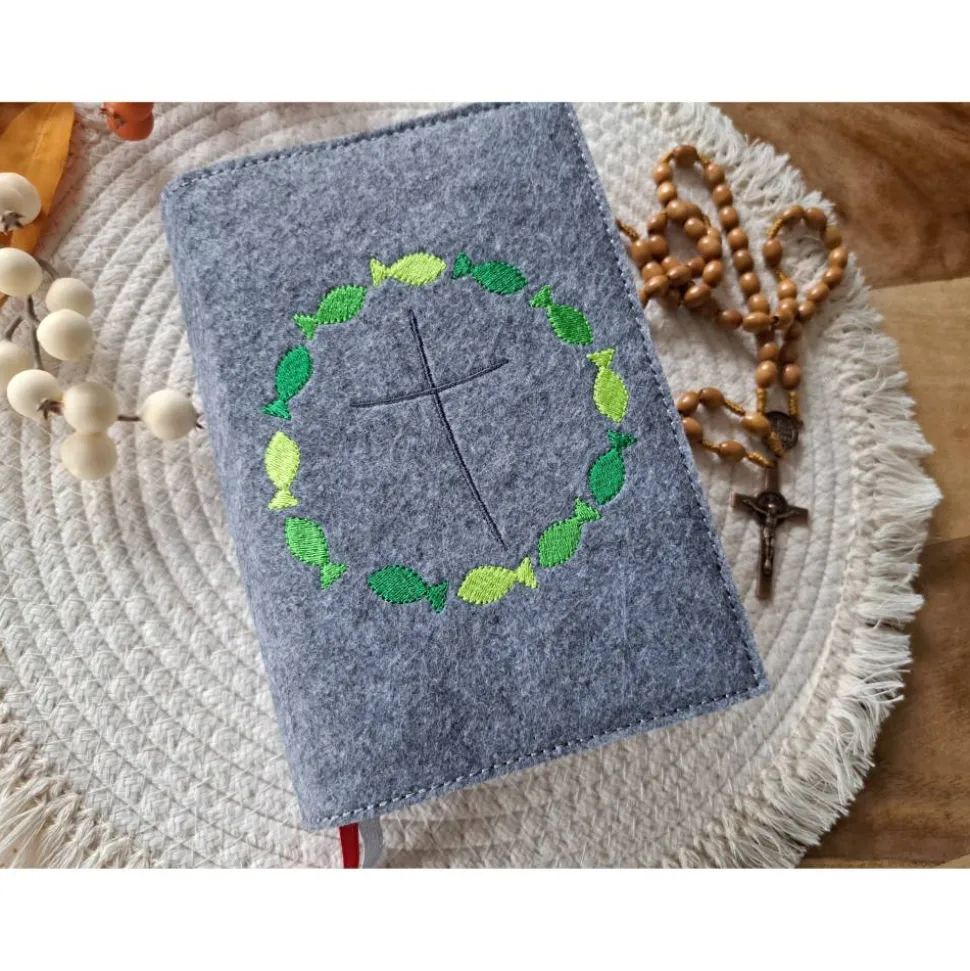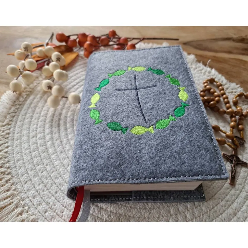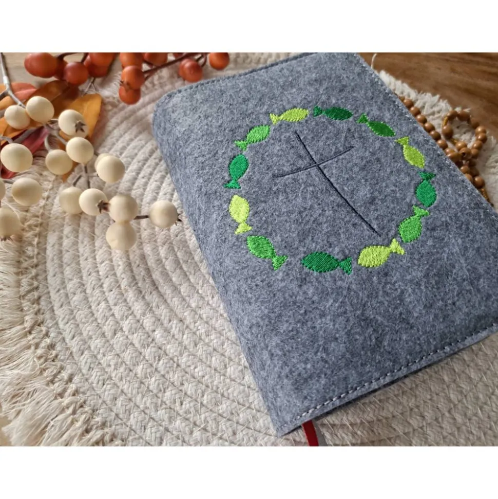 Gotteslobhülle Filz Kommunion 2025 kommt her und esst! personalisierbar Einband Handgemachte Filzhülle Fische grün