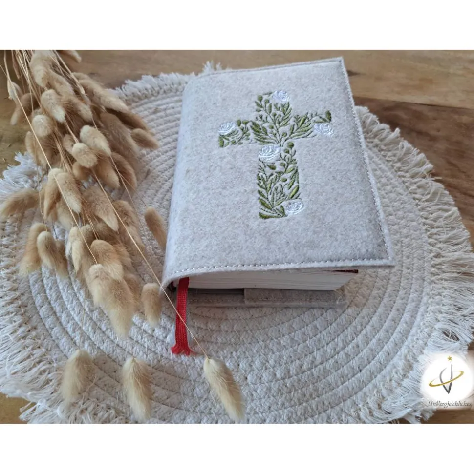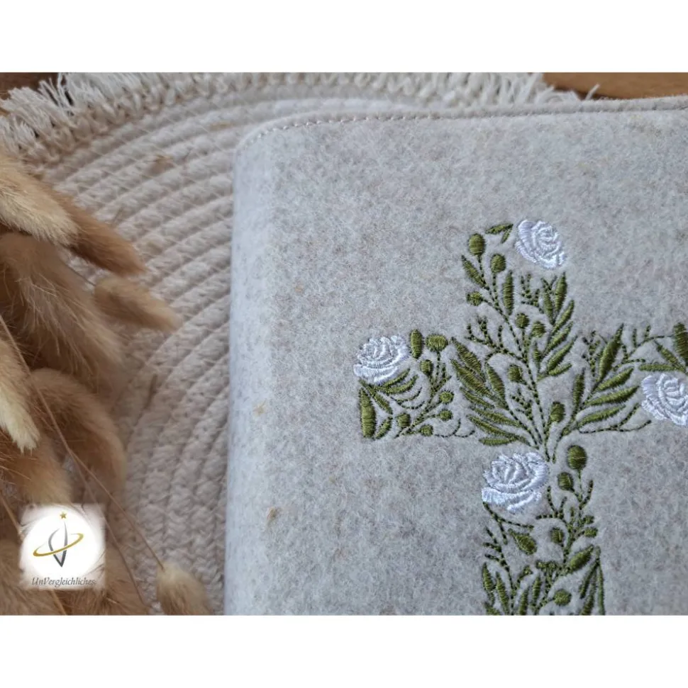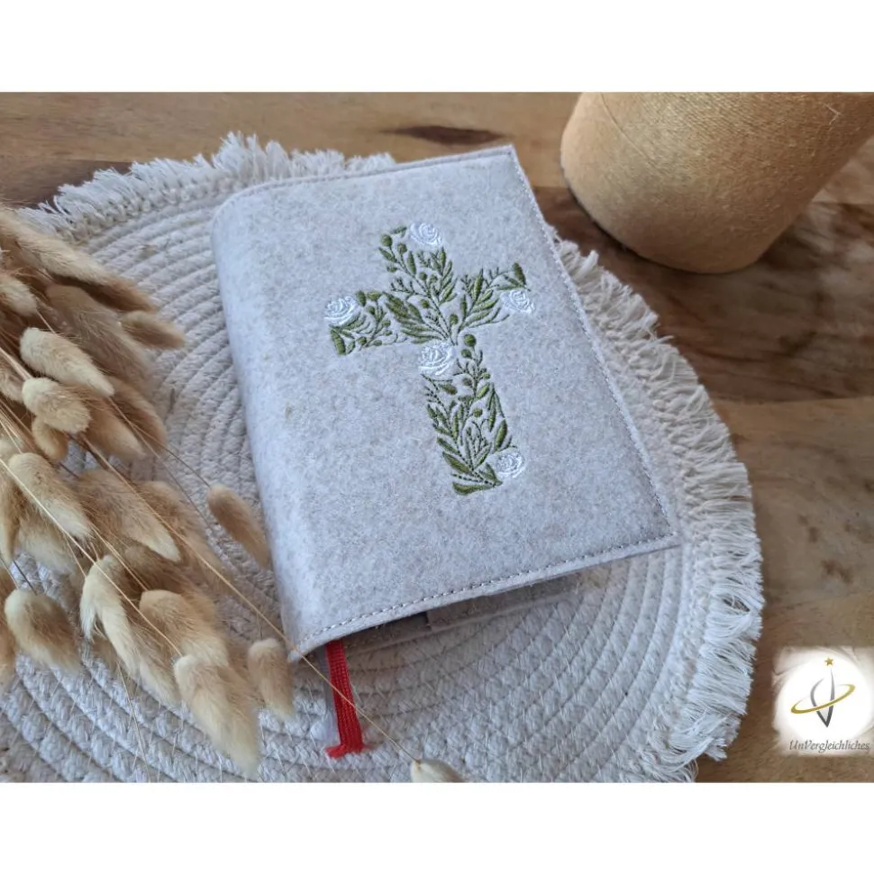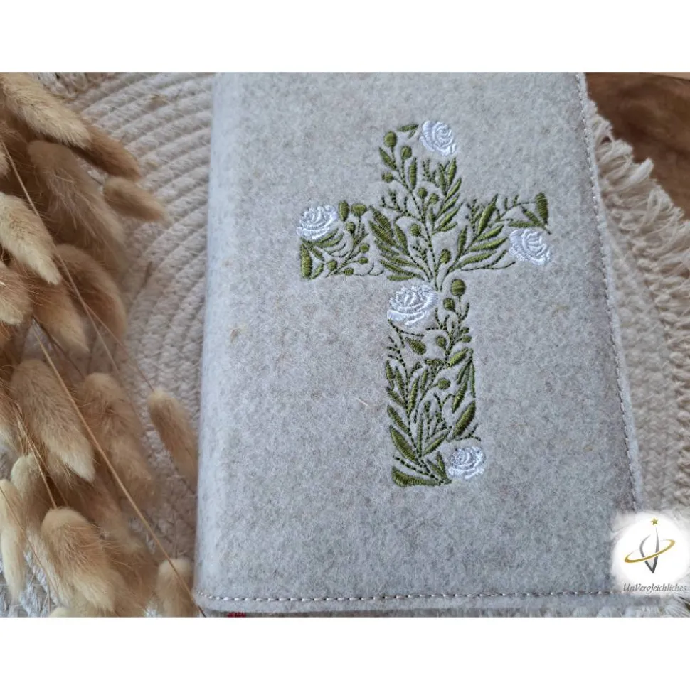 Die Hülle kann individuell mit dem Namen des Kindes und dem Datum der Erstkommunion gestaltet werden, was sie zu einem ganz besonderen Andenken an diesen wichtigen Tag macht. Die Bestickung erfolgt auf der Vorderseite der Hülle und wird mit modernster Technologie präzise und dauerhaft in den Filz eingearbeitet.