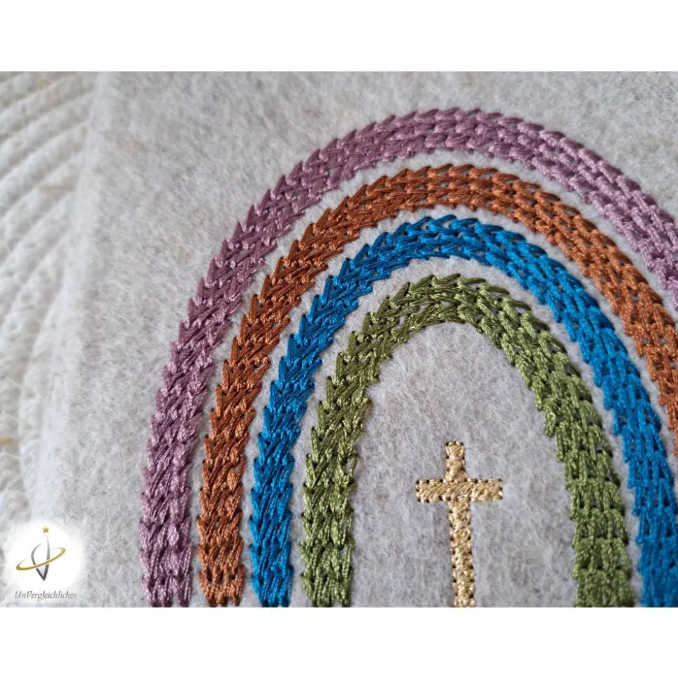 Die Hülle kann individuell mit dem Namen des Kindes und dem Datum der Erstkommunion gestaltet werden, was sie zu einem ganz besonderen Andenken an diesen wichtigen Tag macht. Die Bestickung erfolgt auf der Vorderseite der Hülle und wird mit modernster Technologie präzise und dauerhaft in den Filz eingearbeitet.