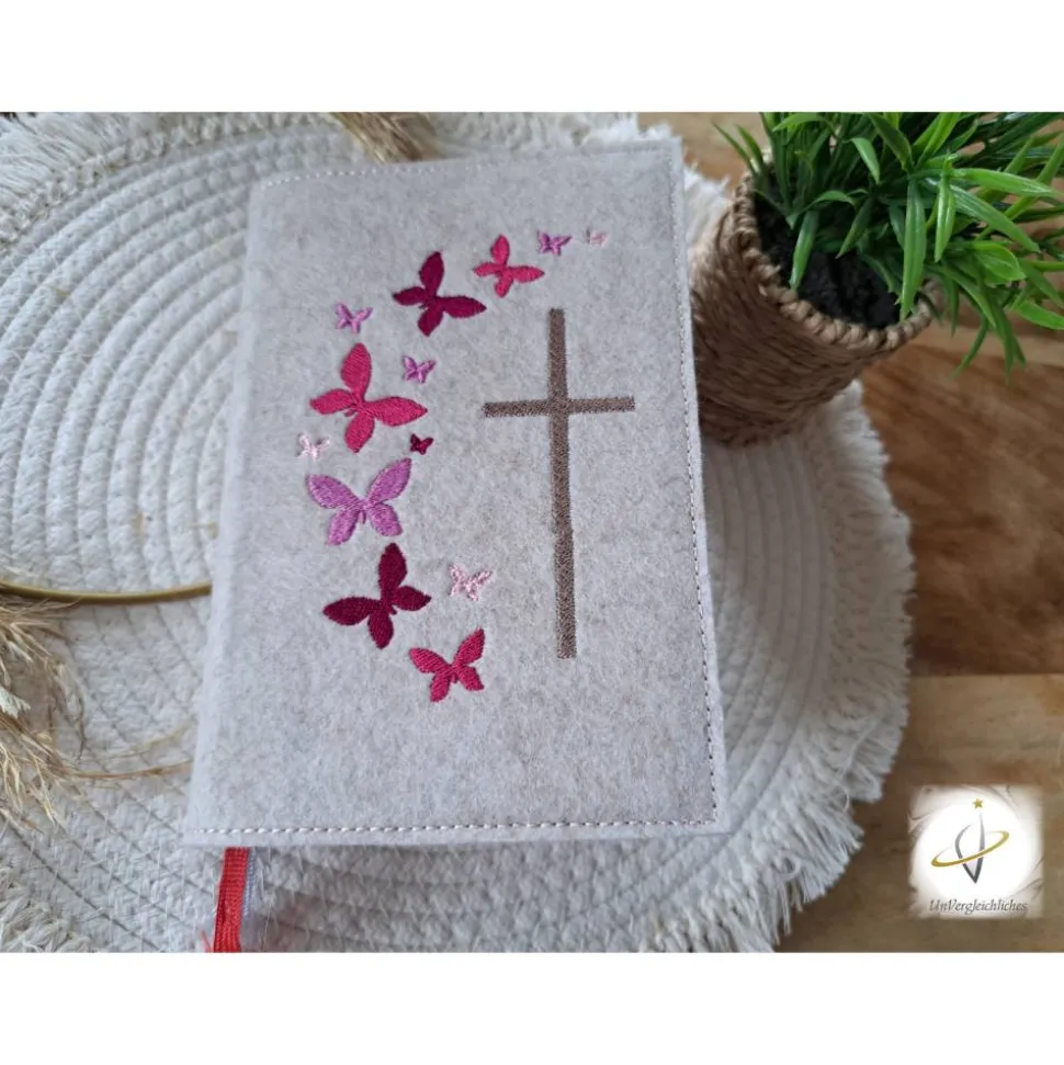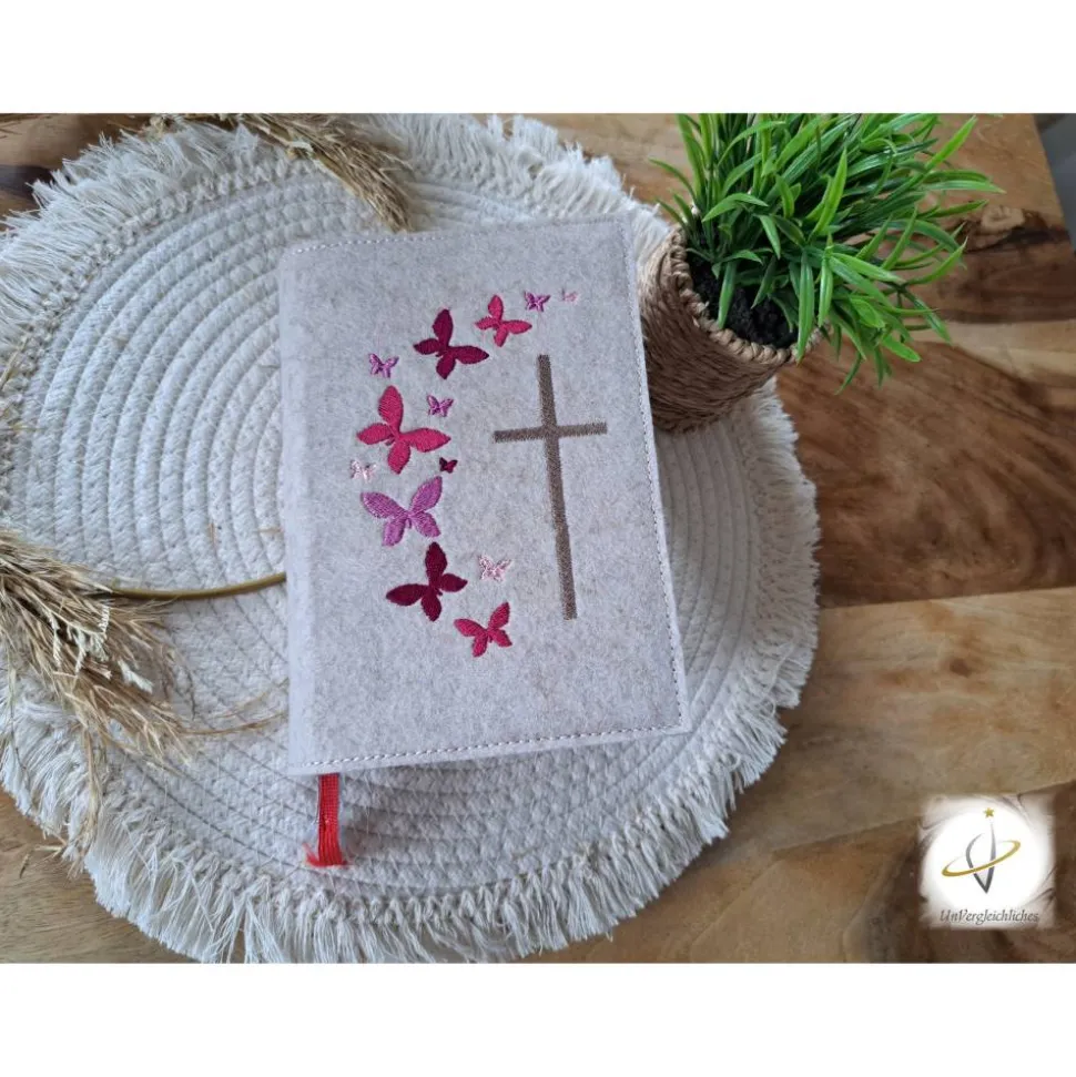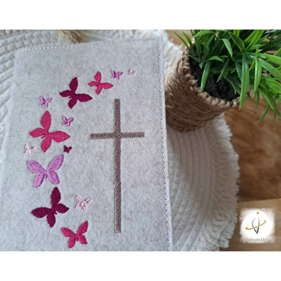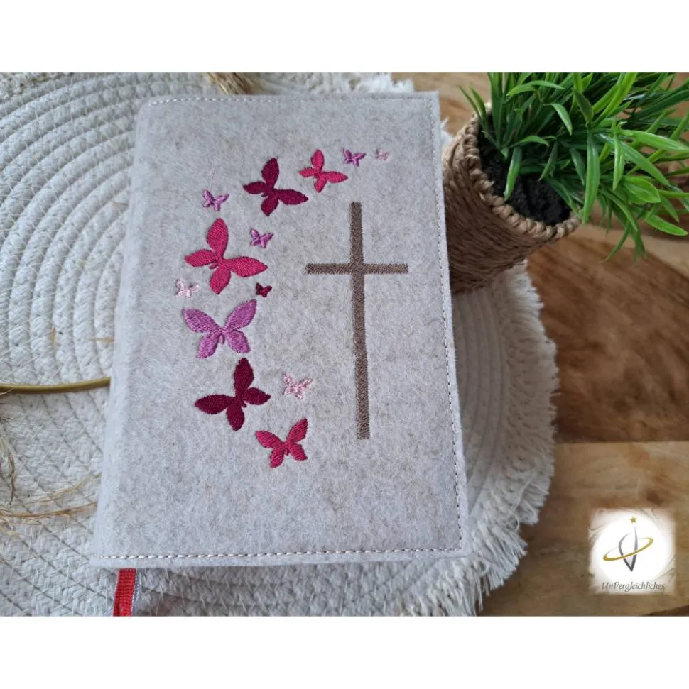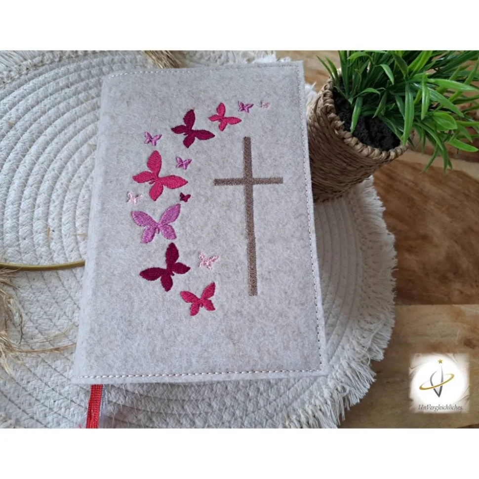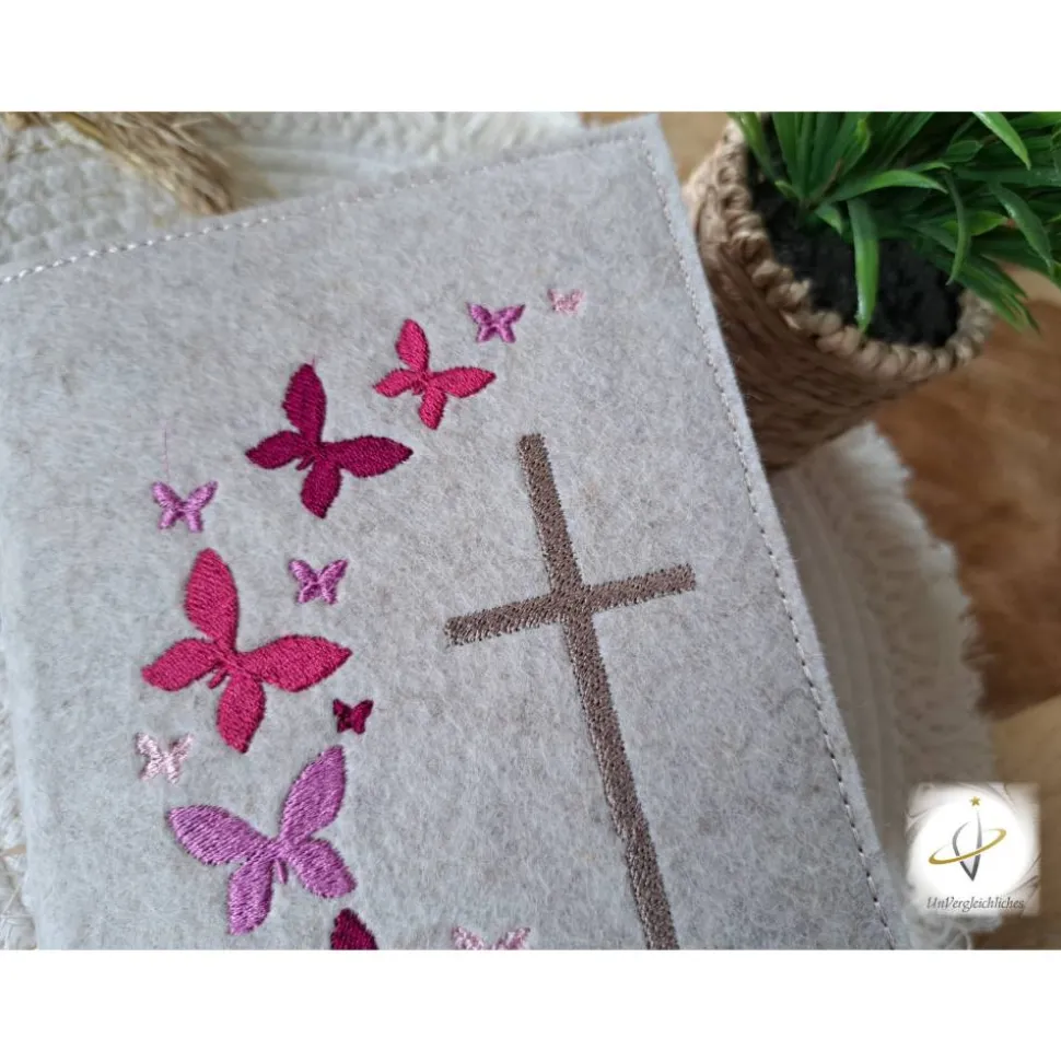 Die Hülle kann individuell mit dem Namen des Kindes und dem Datum der Erstkommunion gestaltet werden, was sie zu einem ganz besonderen Andenken an diesen wichtigen Tag macht. Die Bestickung erfolgt auf der Vorderseite der Hülle und wird mit modernster Technologie präzise und dauerhaft in den Filz eingearbeitet.