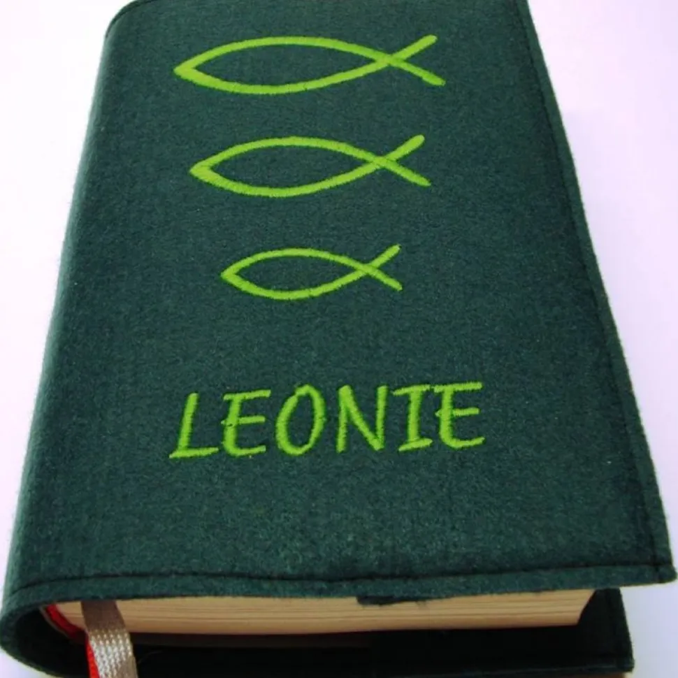 Entdecke die liebevoll handgefertigte Gotteslobhülle aus hochwertigem 3 mm starkem Filz in der Farbe petrol, kunstvoll verziert mit hellgrünen Fischen.