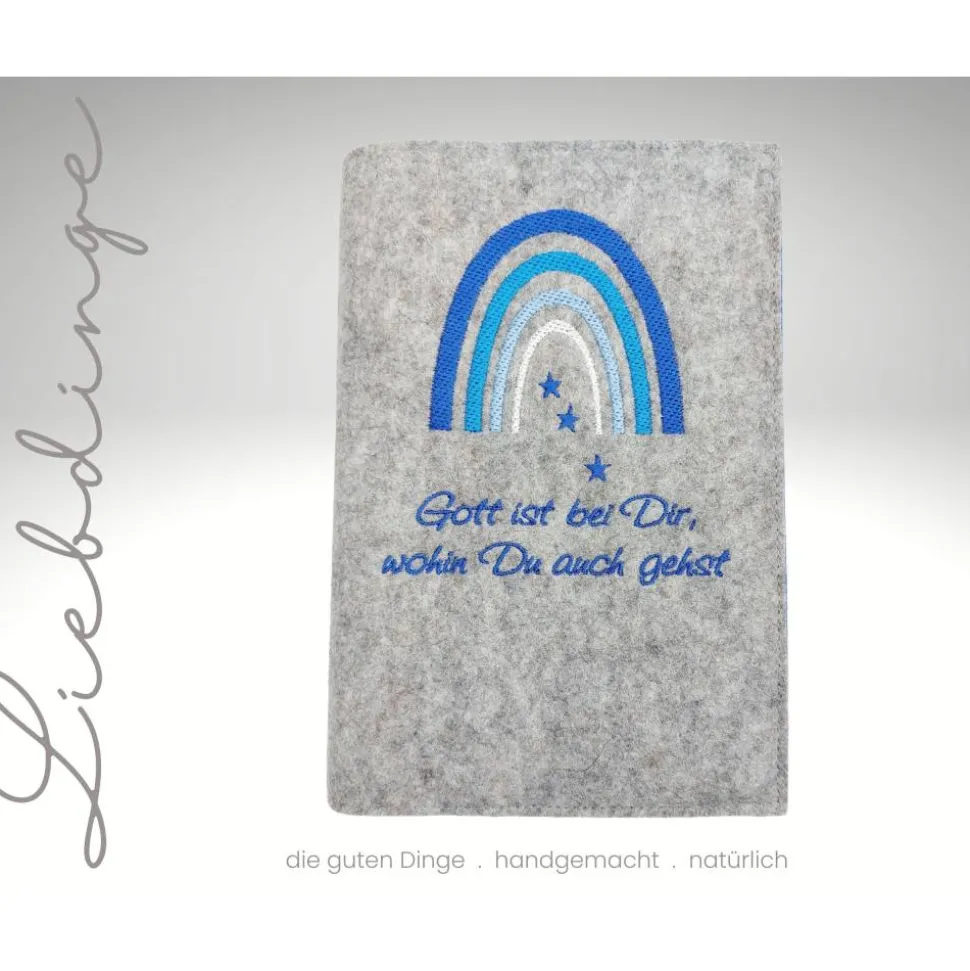 Edel und haltbar bestickt mit einem Regenbogen in Blautönen auf dem cover.