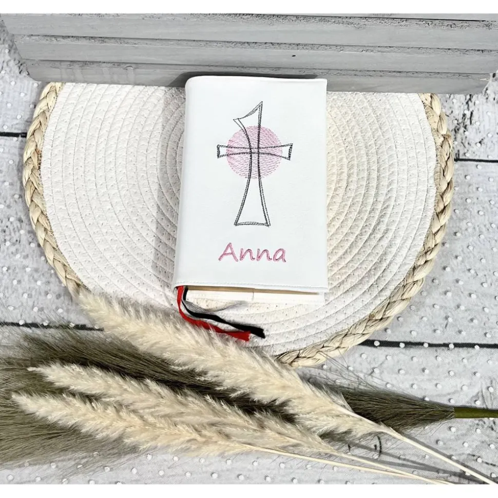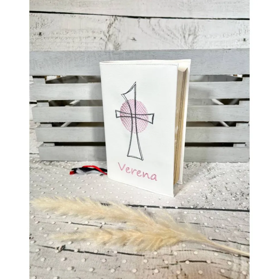 ♥ Liebevoll gestaltete Gotteslobhülle/Gebetsbuchhülle aus weißem Kunstleder mit Kreuz, gern – gegen Aufpreis – mit Namen des Kindes. ♥