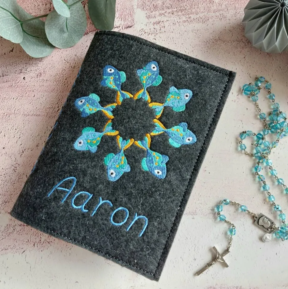 Hier aus schönem dunkelgrauem Filz bestickt mit einem Reigen aus Fischen. Gerne sticke ich gegen Aufpreis zusätzlich noch den Namen und/oder das Datum auf. Bitte beachte, dass dadurch das Motiv kleiner wird. Falls du die Hülle lieber in einer anderen Farben (siehe meine anderen Gotteslobhüllen) oder das Motiv in anderen Farben haben möchtest, vermerke das bitte in den Bemerkungen. Gerne schicke ich dir nach Kaufabschluss ein Foto der neuen Farbzusammenstellung zu.