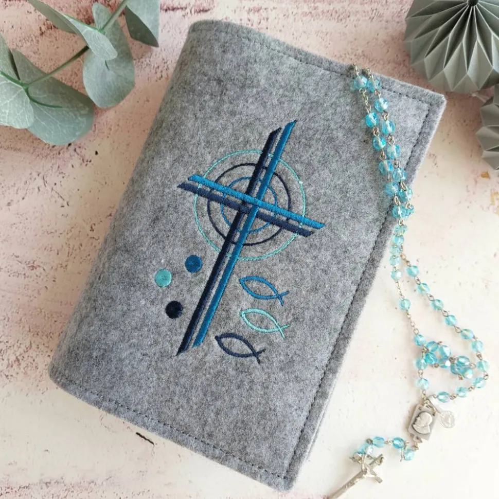 Hier aus schönem grau meliertem Filz bestickt mit einem Kreuz. Gerne sticke ich gegen Aufpreis zusätzlich noch den Namen und/oder das Datum auf. Bitte beachte, dass dadurch das Motiv kleiner wird. Falls du die Hülle lieber in einer anderen Farben (siehe meine anderen Gotteslobhüllen) oder das Motiv in anderen Farben haben möchtest, vermerke das bitte in den Bemerkungen. Gerne schicke ich dir nach Kaufabschluss ein Foto der neuen Farbzusammenstellung zu.