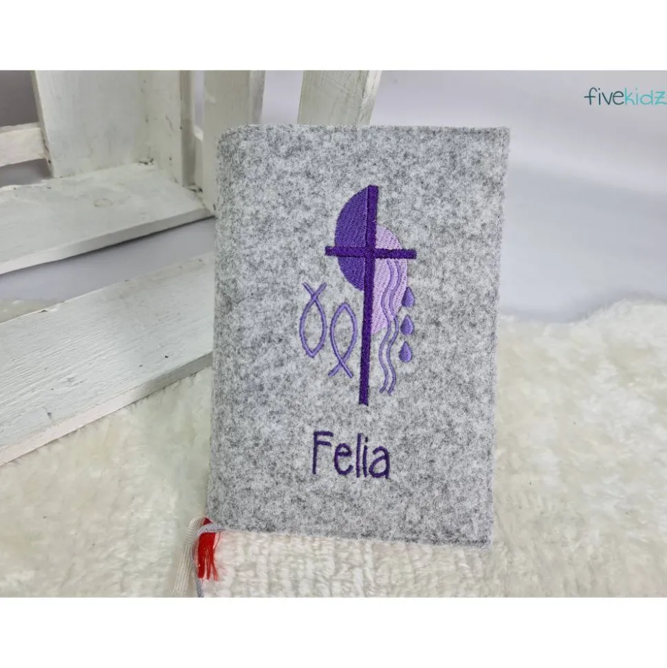 Dieser Einband ist aus hochwertigem Wollfilz gefertigt. Es ist bestickt mit diesem wunderschönen kirchlichen Motiv. Die Farben der Bestickung können Sie auch gerne frei wählen. Hierzu bitte einfach eine Nachricht oder einen Kommentar zum Kauf dazuschreiben. Ansonsten wird es wie in der Abbildung gefertigt. Das verwendete Filz ist hier in einem melierten grau. Bestickt in Lila und Fliedertönen.