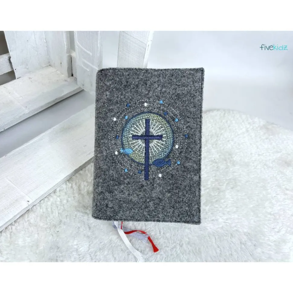Dieser Einband ist aus hochwertigem Wollfilz gefertigt. Es ist bestickt mit diesem wunderschönen kirchlichen Motiv. Die Farben der Bestickung können Sie auch gerne frei wählen. Hierzu bitte einfach eine Nachricht oder einen Kommentar zum Kauf dazuschreiben. Ansonsten wird es wie in der Abbildung gefertigt. Das verwendete Filz ist hier in einem melierten dunklen grau. Bestickt in Blau.