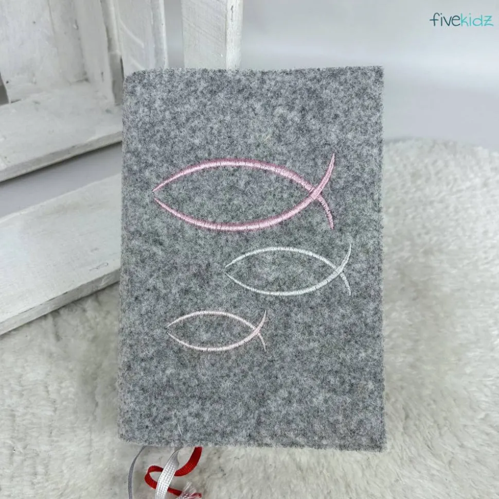Dieser Einband ist aus hochwertigem Wollfilz gefertigt. Es ist bestickt mit diesem wunderschönen kirchlichen Motiv. Die Farben der Bestickung können Sie auch gerne frei wählen. Hierzu bitte einfach eine Nachricht oder einen Kommentar zum Kauf dazuschreiben. Ansonsten wird es wie in der Abbildung gefertigt. Das verwendete Filz ist hier in einem melierten grau. Bestickt in Rosa und Hellgrau.