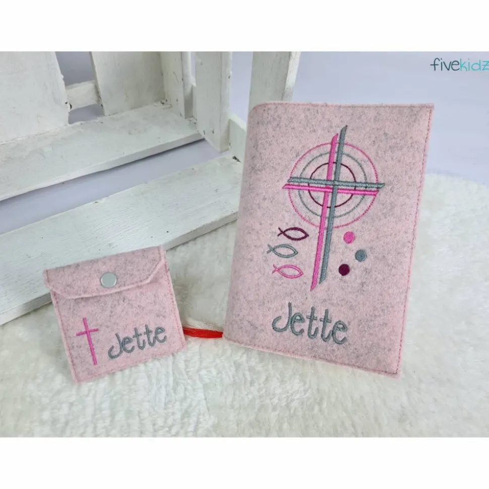 Dieser Einband ist aus hochwertigem Wollfilz gefertigt. Es ist bestickt mit diesem wunderschönen kirchlichen Motiv. Die Farben der Bestickung können Sie auch gerne frei wählen. Hierzu bitte einfach eine Nachricht oder einen Kommentar zum Kauf dazuschreiben. Ansonsten wird es wie in der Abbildung gefertigt. Das verwendete Filz ist hier in einem melierten altrosa. Bestickt in Pink- und Grautönen.