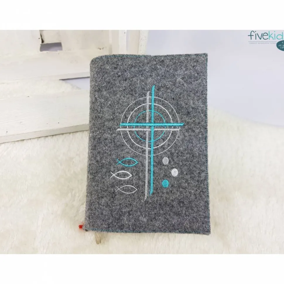 Dieser Einband ist aus hochwertigem Wollfilz gefertigt. Es ist bestickt mit diesem wunderschönen kirchlichen Motiv. Die Farben der Bestickung können Sie auch gerne frei wählen. Hierzu bitte einfach eine Nachricht oder einen Kommentar zum Kauf dazuschreiben. Ansonsten wird es wie in der Abbildung gefertigt. Das verwendete Filz ist hier in einem melierten dunkelgrau. Bestickt in Türkis- und Silbertönen.