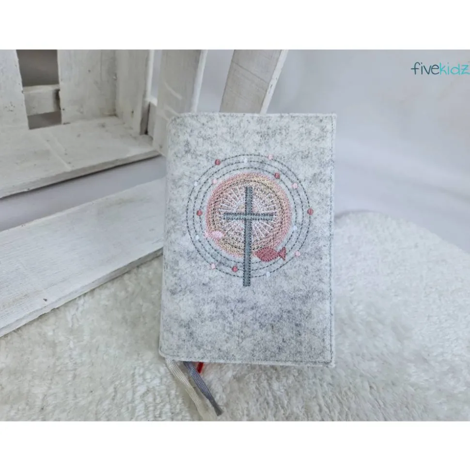 Dieser Einband ist aus hochwertigem Wollfilz gefertigt. Es ist bestickt mit diesem wunderschönen kirchlichen Motiv. Die Farben der Bestickung können Sie auch gerne frei wählen. Hierzu bitte einfach eine Nachricht oder einen Kommentar zum Kauf dazuschreiben. Ansonsten wird es wie in der Abbildung gefertigt. Das verwendete Filz ist hier in einem melierten hellem grau. Bestickt in Altrosa-, Rose- und Silbertönen.