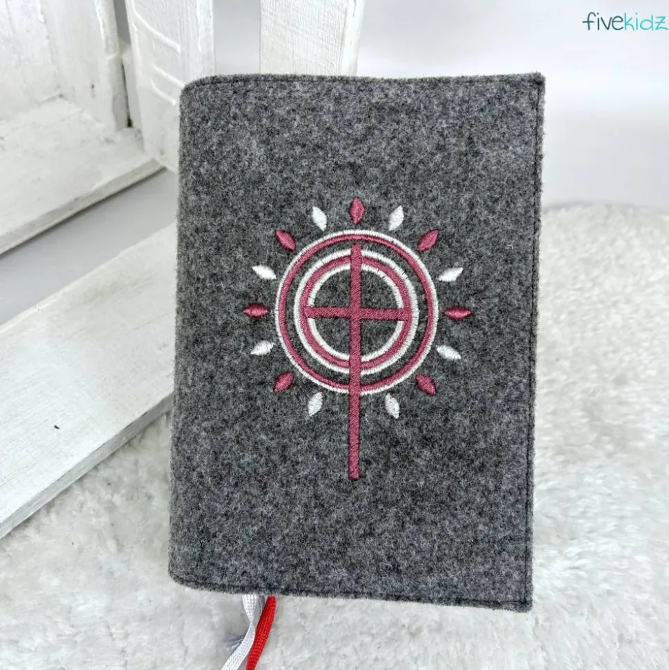 Dieser Einband ist aus hochwertigem Wollfilz gefertigt. Es ist bestickt mit diesem wunderschönen kirchlichen Motiv. Die Farben der Bestickung können Sie auch gerne frei wählen. Hierzu bitte einfach eine Nachricht oder einen Kommentar zum Kauf dazuschreiben. Ansonsten wird es wie in der Abbildung gefertigt. Das verwendete Filz ist hier in einem melierten dunklen grau. Bestickt in Altpink und Cremeweiß.