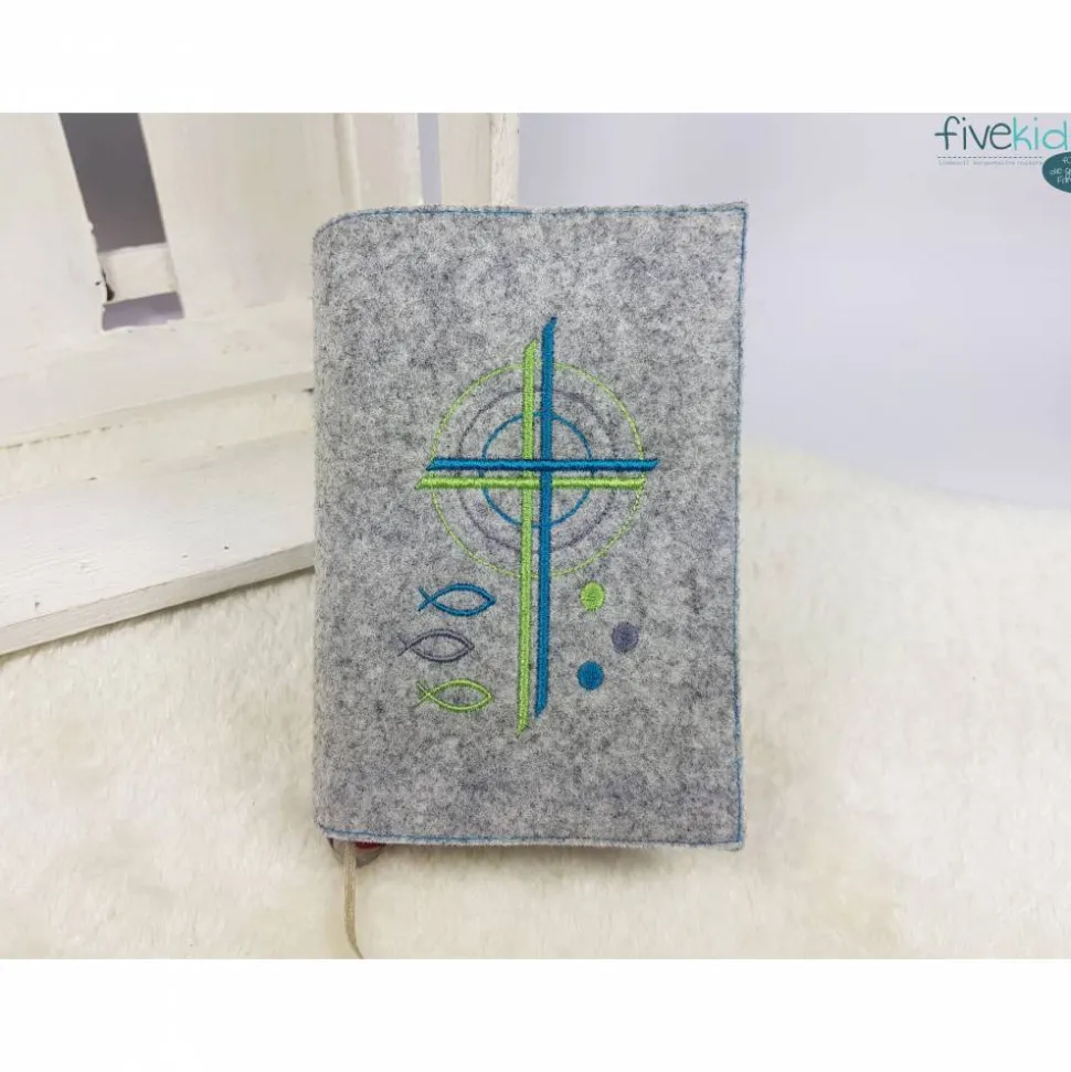 Dieser Einband ist aus hochwertigem Wollfilz gefertigt. Es ist bestickt mit diesem wunderschönen kirchlichen Motiv. Die Farben der Bestickung können Sie auch gerne frei wählen. Hierzu bitte einfach eine Nachricht oder einen Kommentar zum Kauf dazuschreiben. Ansonsten wird es wie in der Abbildung gefertigt. Das verwendete Filz ist hier in einem melierten hellgrau. Bestickt in Türkis- Grün- und Silbertönen.