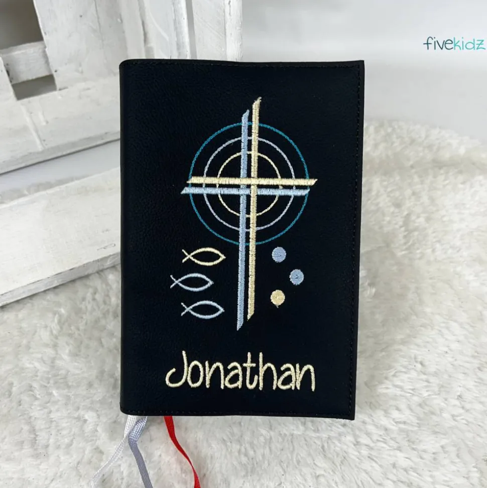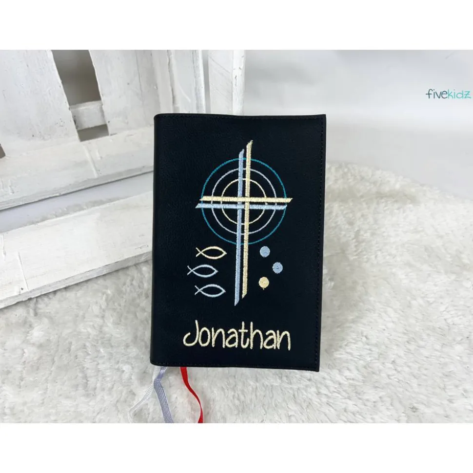 Dieser Einband ist aus hochwertigem Rindsleder gefertigt. Es ist bestickt mit diesem wunderschönen kirchlichen Motiv. Die Farben der Bestickung können Sie auch gerne frei wählen. Hierzu bitte einfach eine Nachricht oder einen Kommentar zum Kauf dazuschreiben. Ansonsten wird es wie in der Abbildung gefertigt. Das verwendete Leder ist hier in einem schwarz. Bestickt in Gold, Hellblau und Petrol.