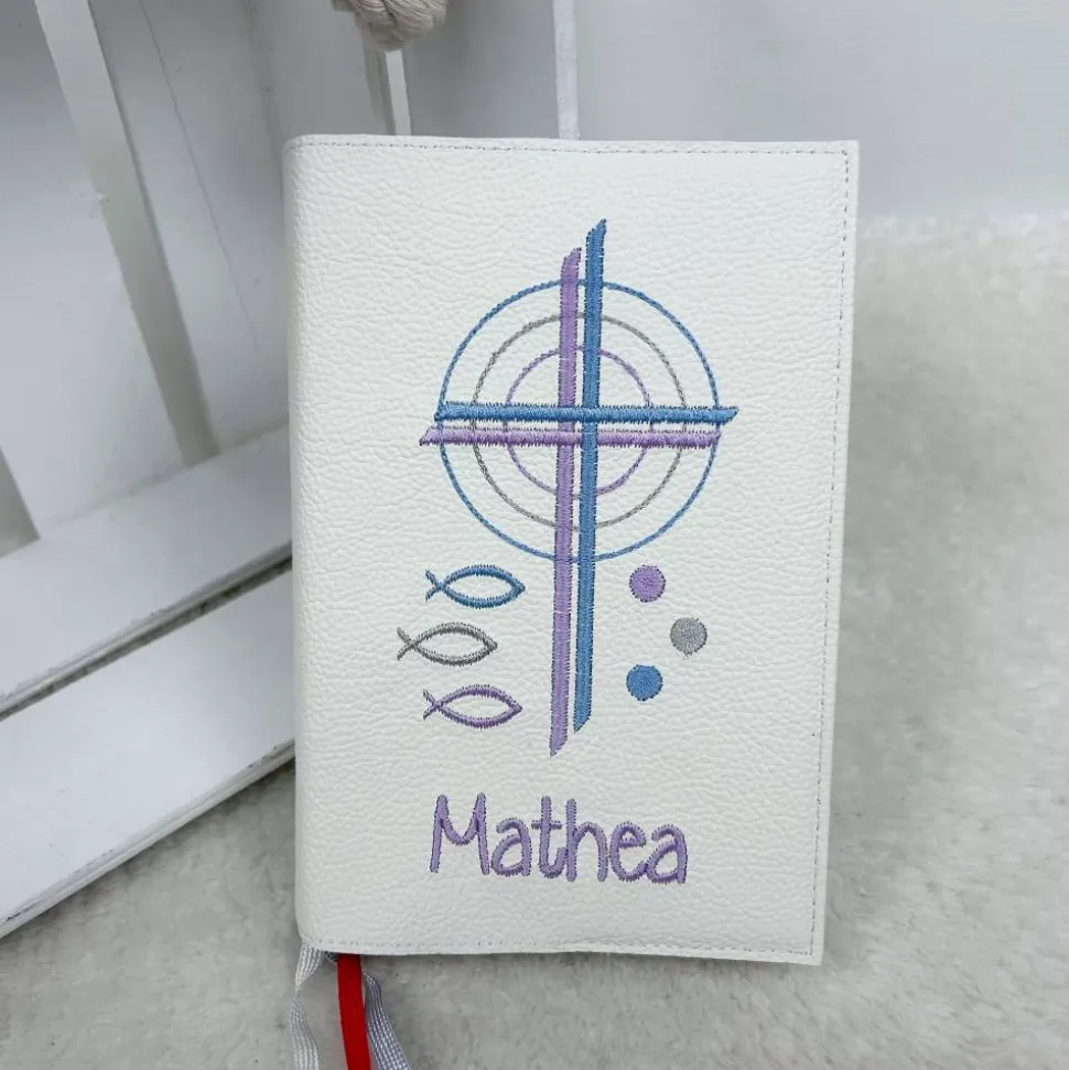 Dieser Einband ist aus echtem Rindsleder gefertigt. Es ist bestickt mit diesem wunderschönen kirchlichen Motiv. Die Farben der Bestickung können Sie auch gerne frei wählen. Hierzu bitte einfach eine Nachricht oder einen Kommentar zum Kauf dazuschreiben. Ansonsten wird es wie in der Abbildung gefertigt. Das verwendete Leder ist hier in einem altweiß. Bestickt in Flieder, Hellblau und Silber.