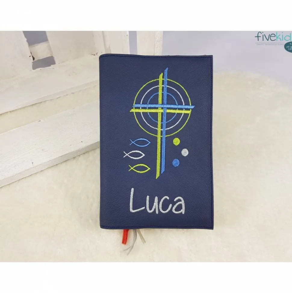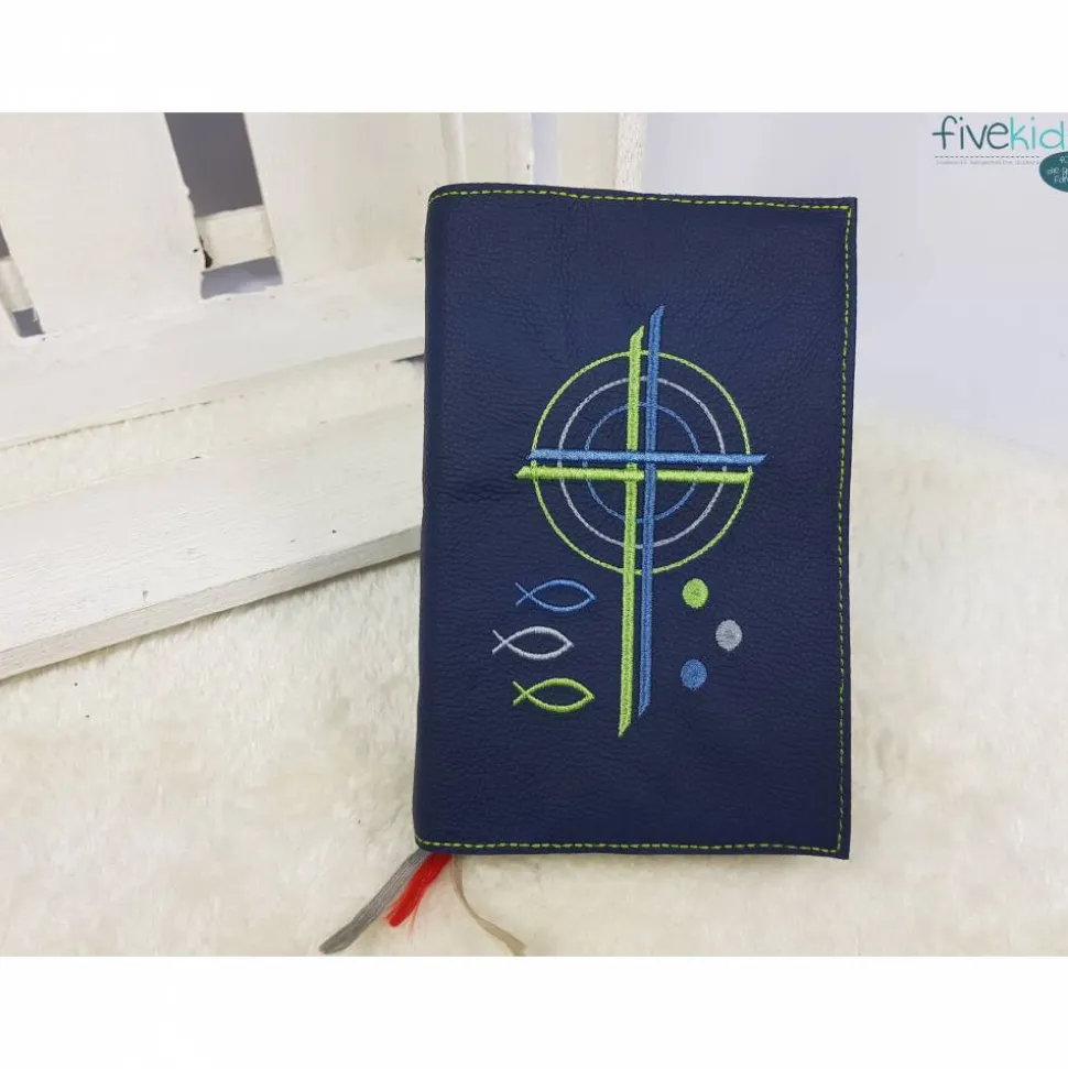 Dieser Einband ist aus hochwertigem Echtleder gefertigt. Es ist bestickt mit diesem wunderschönen kirchlichen Motiv. Die Farben der Bestickung können Sie auch gerne frei wählen. Hierzu bitte einfach eine Nachricht oder einen Kommentar zum Kauf dazuschreiben. Ansonsten wird es wie in der Abbildung gefertigt. Das verwendete Leder ist hier in einem dunkelblau. Bestickt in Grün- Blau- und Silbertönen.