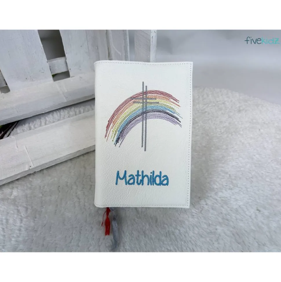 Dieser Einband ist aus echtem Rindsleder gefertigt. Es ist bestickt mit diesem wunderschönen kirchlichen Motiv. Die Farben der Bestickung können Sie auch gerne frei wählen. Hierzu bitte einfach eine Nachricht oder einen Kommentar zum Kauf dazuschreiben. Ansonsten wird es wie in der Abbildung gefertigt. Das verwendete Leder ist hier in einem altweiß. Bestickt in Silber und Regenbogenfarben.