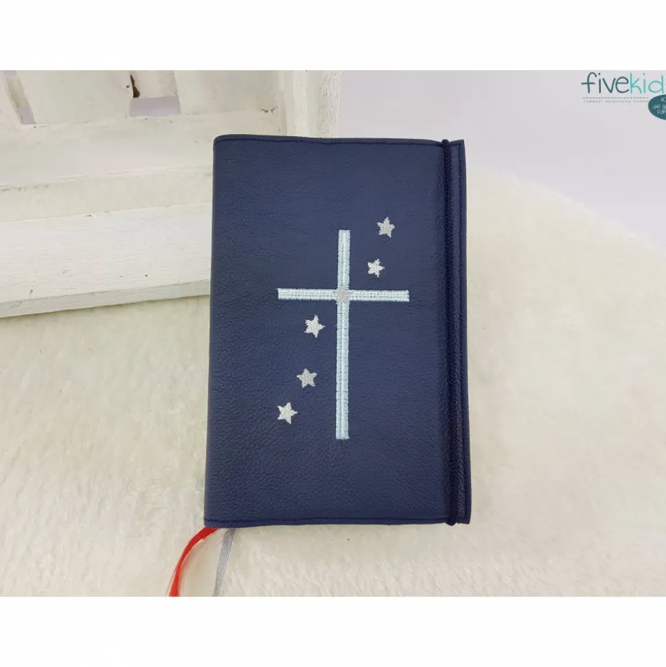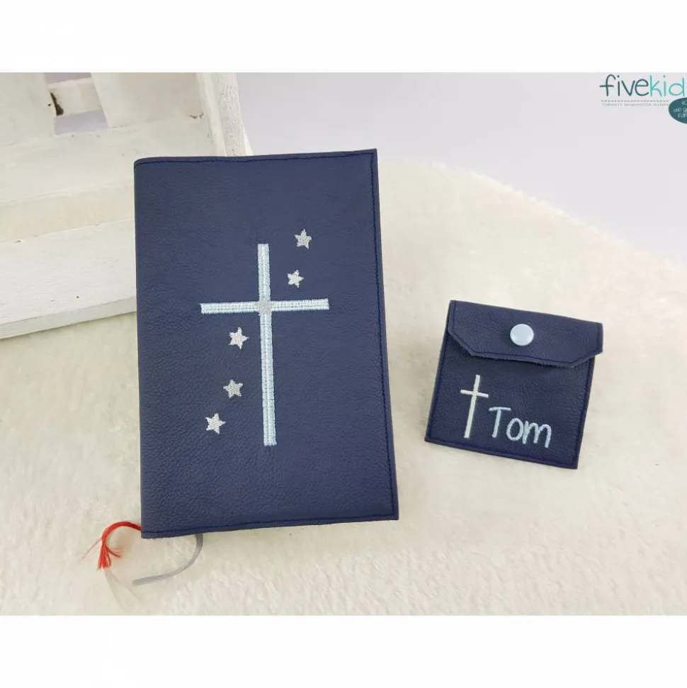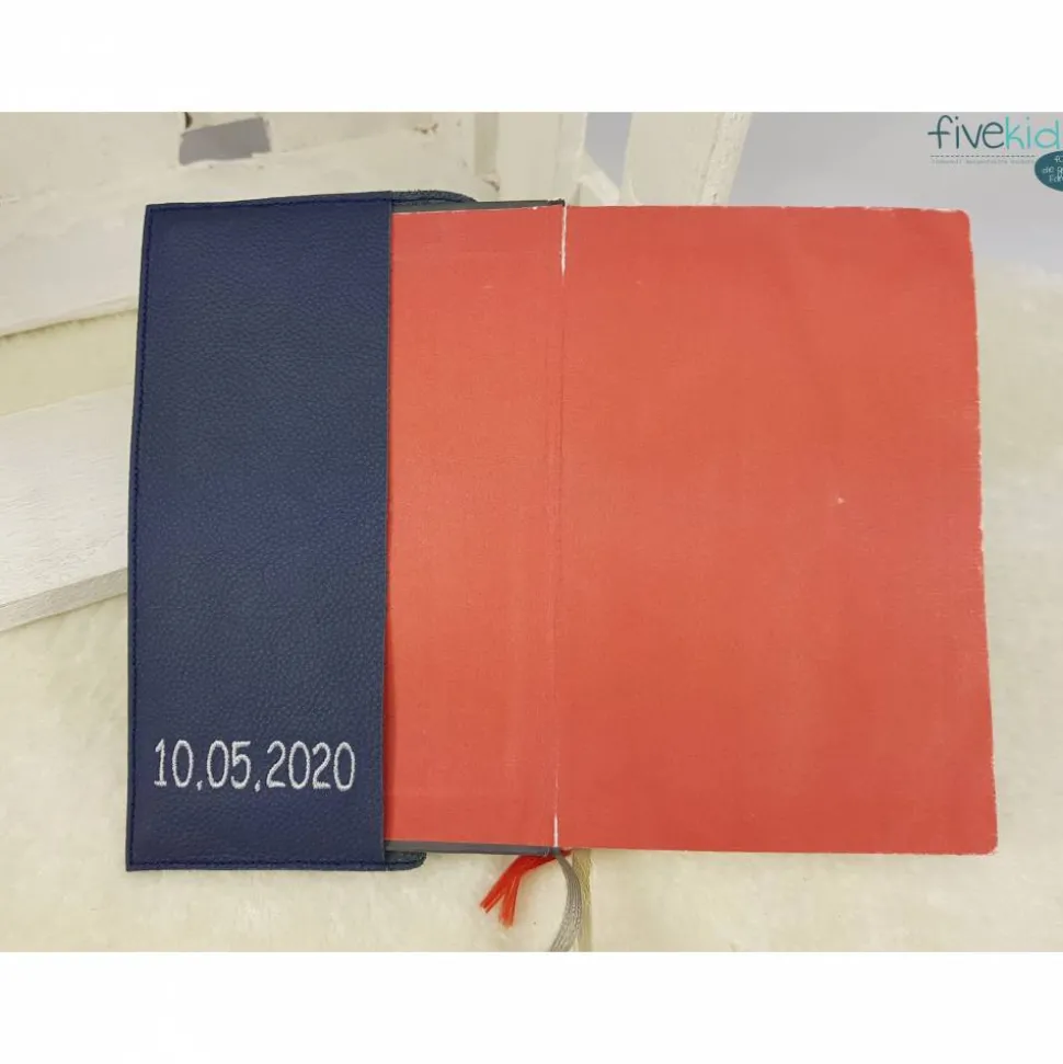 Dieser Einband ist aus hochwertigem Echtleder gefertigt. Es ist bestickt mit diesem wunderschönen kirchlichen Motiv. Die Farben der Bestickung können Sie auch gerne frei wählen. Hierzu bitte einfach eine Nachricht oder einen Kommentar zum Kauf dazuschreiben. Ansonsten wird es wie in der Abbildung gefertigt. Das verwendete Leder ist hier in einem dunklem blau. Bestickt in hellblau, hellgrau und weiß.