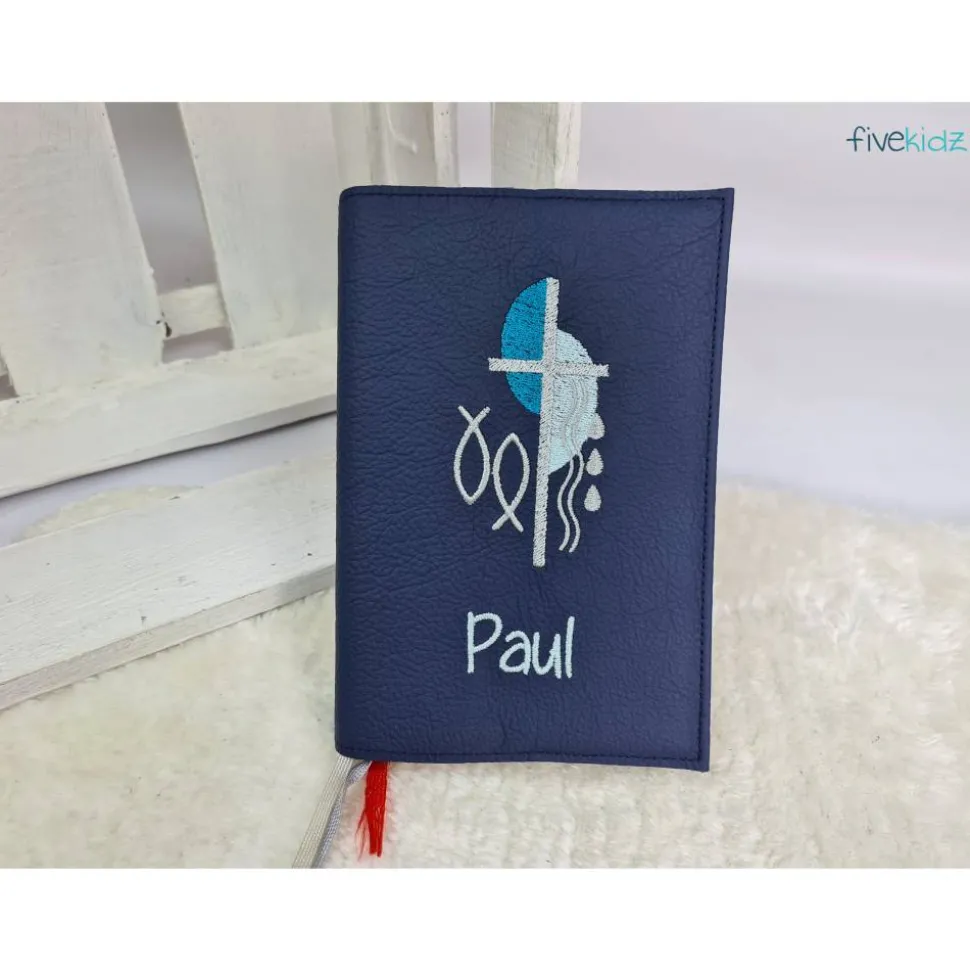 Dieser Einband ist aus hochwertigem Echtleder gefertigt. Es ist bestickt mit diesem wunderschönen kirchlichen Motiv. Die Farben der Bestickung können Sie auch gerne frei wählen. Hierzu bitte einfach eine Nachricht oder einen Kommentar zum Kauf dazuschreiben. Ansonsten wird es wie in der Abbildung gefertigt. Das verwendete Leder ist hier in einem dunklen blau. Bestickt in Petrol- Mint und Silbertönen.