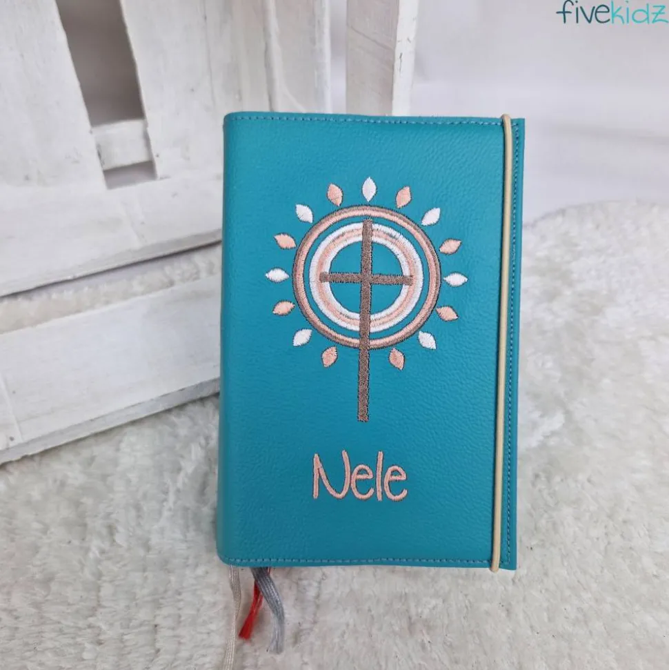 Dieser Einband ist aus hochwertigem Echtleder gefertigt. Es ist bestickt mit diesem wunderschönen kirchlichen Motiv. Die Farben der Bestickung können Sie auch gerne frei wählen. Hierzu bitte einfach eine Nachricht oder einen Kommentar zum Kauf dazuschreiben. Ansonsten wird es wie in der Abbildung gefertigt. Das verwendete Leder ist hier in einem petrol-türkis. Bestickt in Rose, Lachsrosa und Creme-Beige.