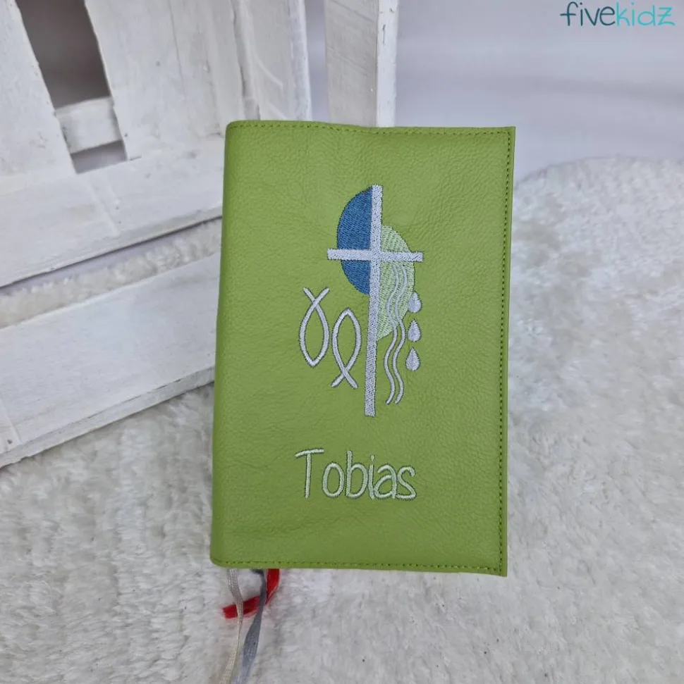 Dieser Einband ist aus hochwertigem Echtleder gefertigt. Es ist bestickt mit diesem wunderschönen kirchlichen Motiv. Die Farben der Bestickung können Sie auch gerne frei wählen. Hierzu bitte einfach eine Nachricht oder einen Kommentar zum Kauf dazuschreiben. Ansonsten wird es wie in der Abbildung gefertigt. Das verwendete Leder ist hier in einem apfelgrün. Bestickt in unterschiedlichen Grüntönen.