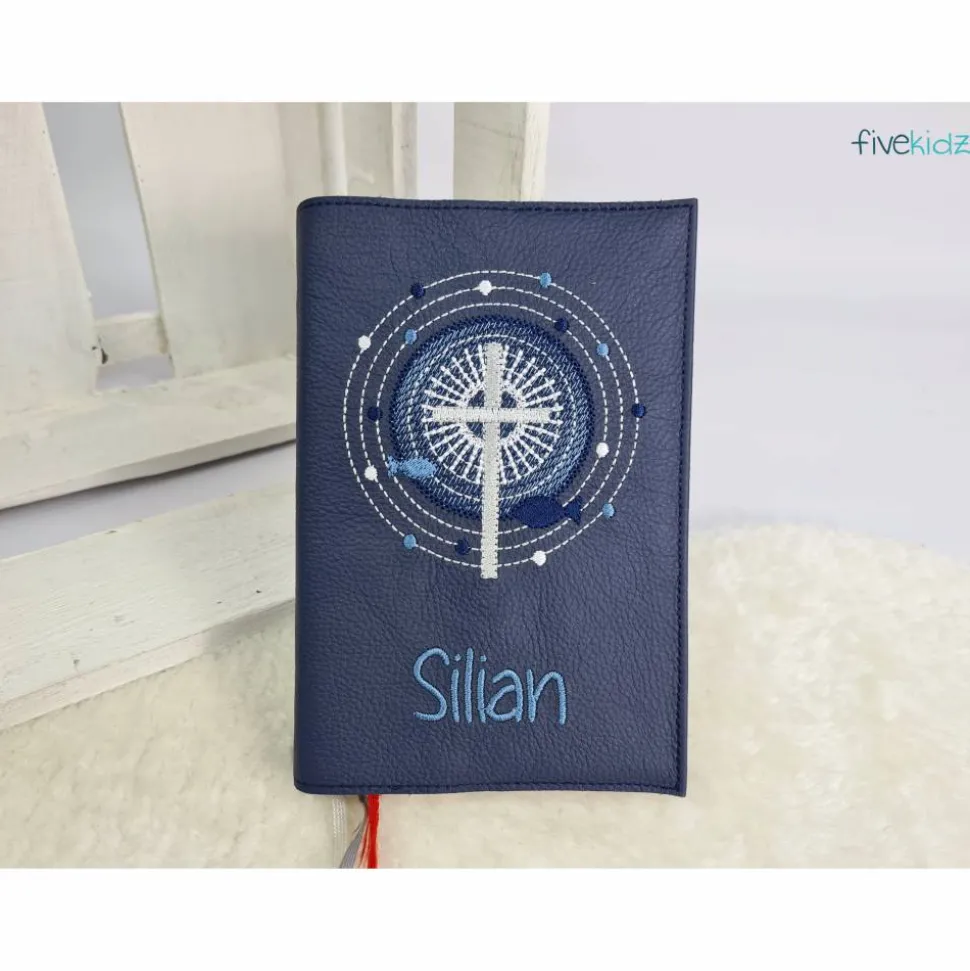Dieser Einband ist aus hochwertigem Echtleder gefertigt. Es ist bestickt mit diesem wunderschönen kirchlichen Motiv. Die Farben der Bestickung können Sie auch gerne frei wählen. Hierzu bitte einfach eine Nachricht oder einen Kommentar zum Kauf dazuschreiben. Ansonsten wird es wie in der Abbildung gefertigt. Das verwendete Leder ist hier in einem dunklen blau. Bestickt in Blau-, Jeansblau- und Silbertönen.