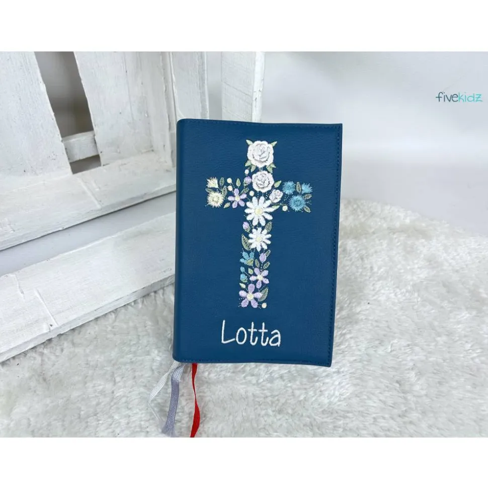 Dieser Einband ist aus hochwertigem Rindsleder gefertigt. Es ist bestickt mit diesem wunderschönen kirchlichen Motiv. Die Farben der Bestickung können Sie auch gerne frei wählen. Hierzu bitte einfach eine Nachricht oder einen Kommentar zum Kauf dazuschreiben. Ansonsten wird es wie in der Abbildung gefertigt. Das verwendete Leder ist hier in einem Jeansblau. Bestickt in Grün, Flieder, Rose, Creme, Hellgelb, Mint und Weiß.