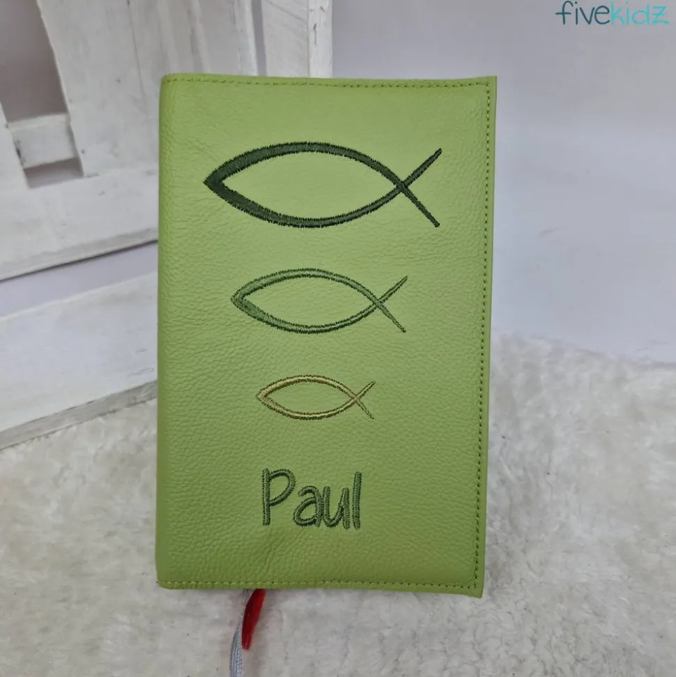 Dieser Einband ist aus hochwertigem Echtleder gefertigt. Es ist bestickt mit diesem wunderschönen kirchlichen Motiv. Die Farben der Bestickung können Sie auch gerne frei wählen. Hierzu bitte einfach eine Nachricht oder einen Kommentar zum Kauf dazuschreiben. Ansonsten wird es wie in der Abbildung gefertigt. Das verwendete Leder ist hier in einem apfelgrün. Bestickt in unterschiedlichen Grüntönen.