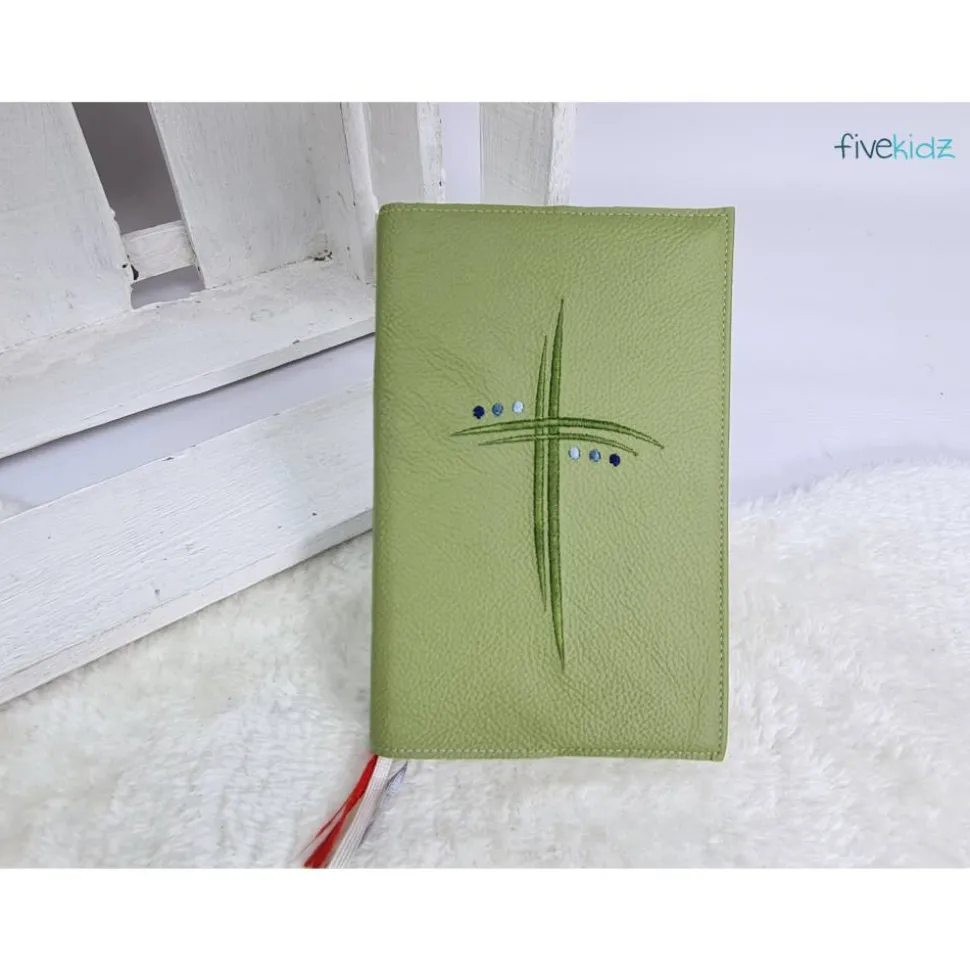 Dieser Einband ist aus hochwertigem Echtleder gefertigt. Es ist bestickt mit diesem wunderschönen kirchlichen Motiv. Die Farben der Bestickung können Sie auch gerne frei wählen. Hierzu bitte einfach eine Nachricht oder einen Kommentar zum Kauf dazuschreiben. Ansonsten wird es wie in der Abbildung gefertigt. Das verwendete Leder ist hier in einem apfelgrün. Bestickt in Grün und Blau.