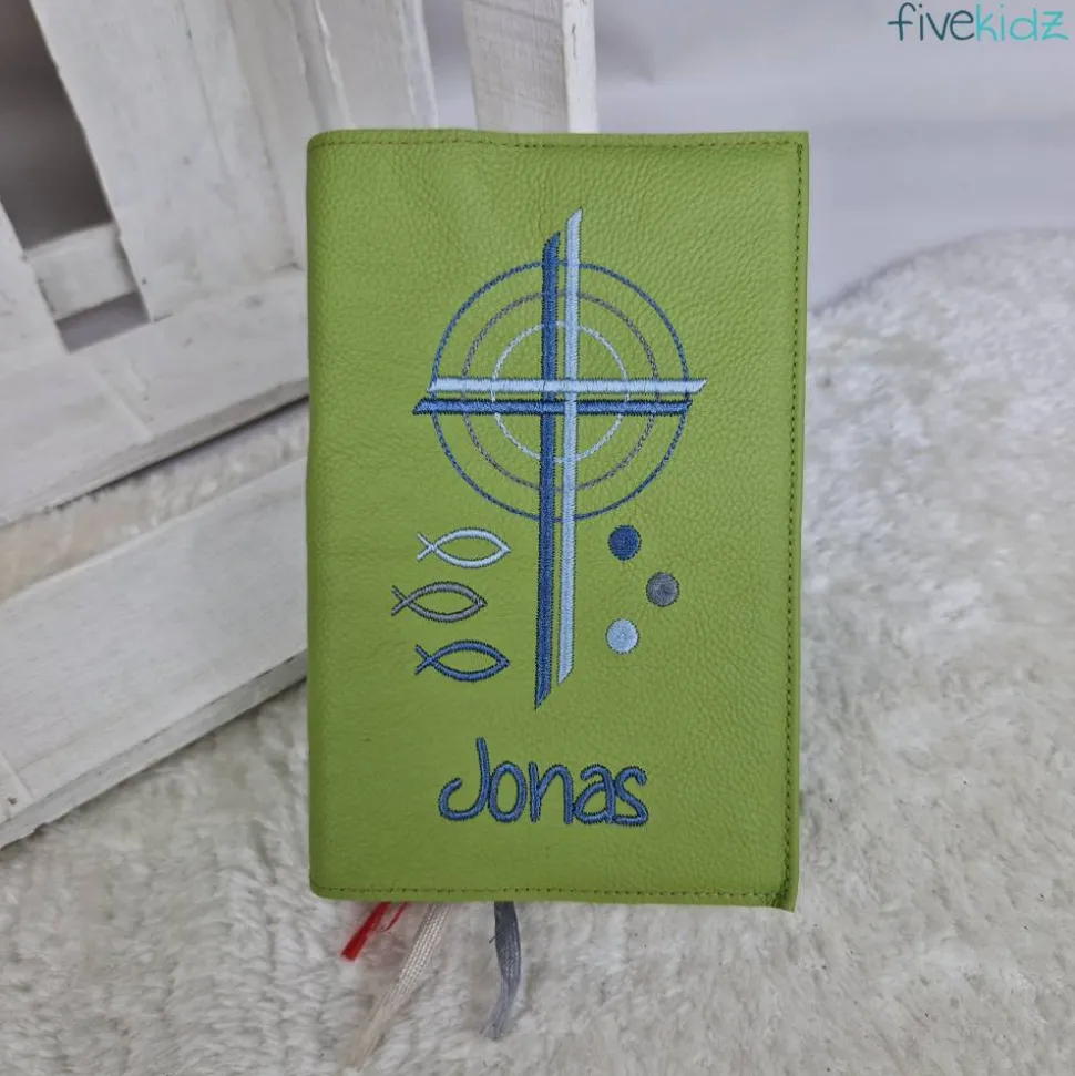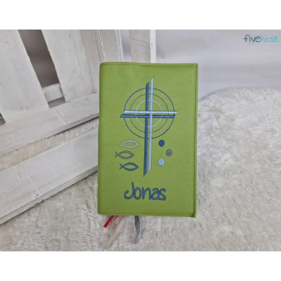 Dieser Einband ist aus hochwertigem Echtleder gefertigt. Es ist bestickt mit diesem wunderschönen kirchlichen Motiv. Die Farben der Bestickung können Sie auch gerne frei wählen. Hierzu bitte einfach eine Nachricht oder einen Kommentar zum Kauf dazuschreiben. Ansonsten wird es wie in der Abbildung gefertigt. Das verwendete Leder ist hier in einem apfelgrün. Bestickt in unterschiedlichen Blautönen.