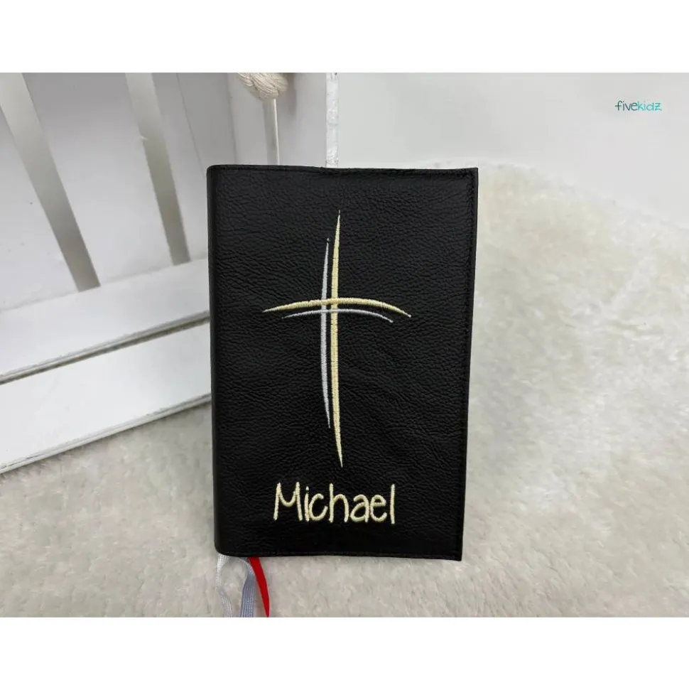 Dieser Einband ist aus hochwertigem Rindsleder gefertigt. Es ist bestickt mit diesem wunderschönen kirchlichen Motiv. Die Farben der Bestickung können Sie auch gerne frei wählen. Hierzu bitte einfach eine Nachricht oder einen Kommentar zum Kauf dazuschreiben. Ansonsten wird es wie in der Abbildung gefertigt. Das verwendete Leder ist hier in einem Schwarz. Bestickt in Gold und Silber.
