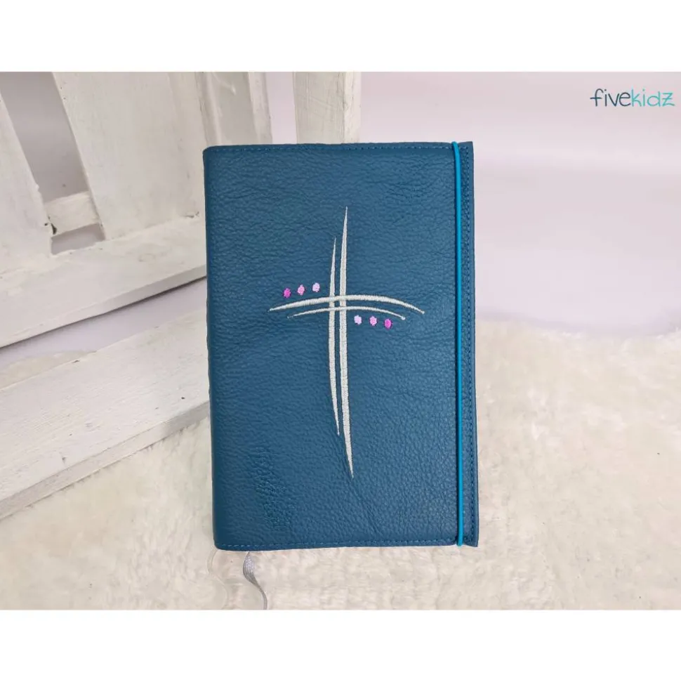 Dieser Einband ist aus hochwertigem Echtleder gefertigt. Es ist bestickt mit diesem wunderschönen kirchlichen Motiv. Die Farben der Bestickung können Sie auch gerne frei wählen. Hierzu bitte einfach eine Nachricht oder einen Kommentar zum Kauf dazuschreiben. Ansonsten wird es wie in der Abbildung gefertigt. Das verwendete Leder ist hier in einem dunklen Petrol. Bestickt in Beere/Lila-, Flieder- und Silbertönen.