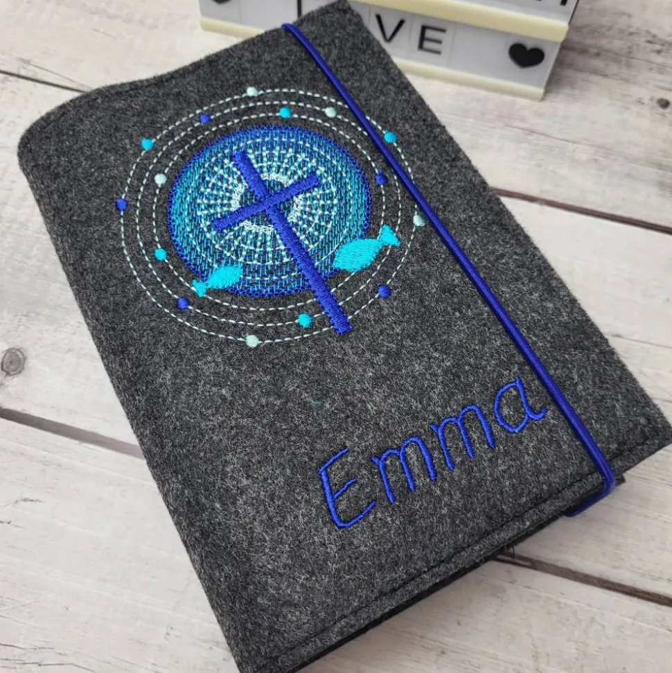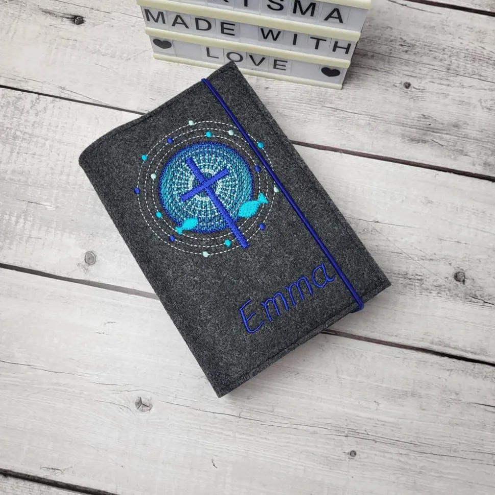 Hochwertige Gotteslobhülle aus Polyesterfilz (3,0 mm), bestickt mit einem Kreuz und strahlendem Kreis (gerne auch mit dem Namen und Datum gegen Aufpreis).