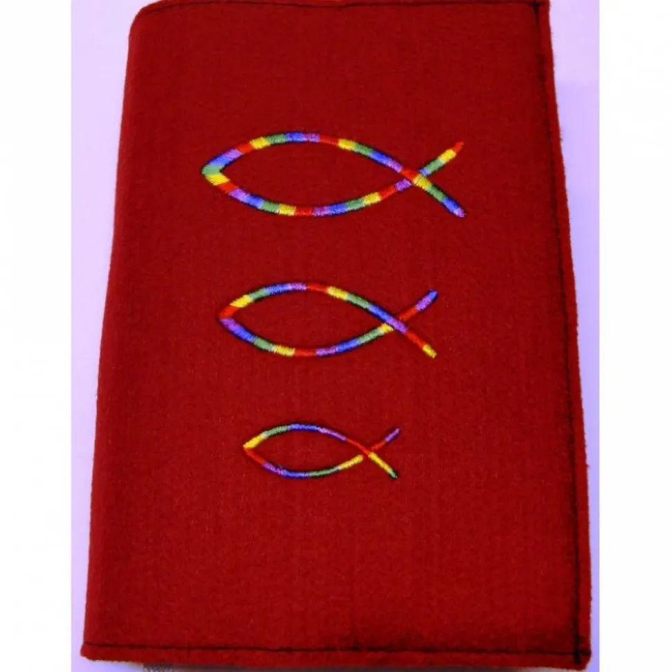 Liebevolle Handarbeit Gotteslobhülle, Einband – handgefertigt aus Filz 3 mm stark, dunkelrot Regenbogenfischen oder mit bunten Fischen.