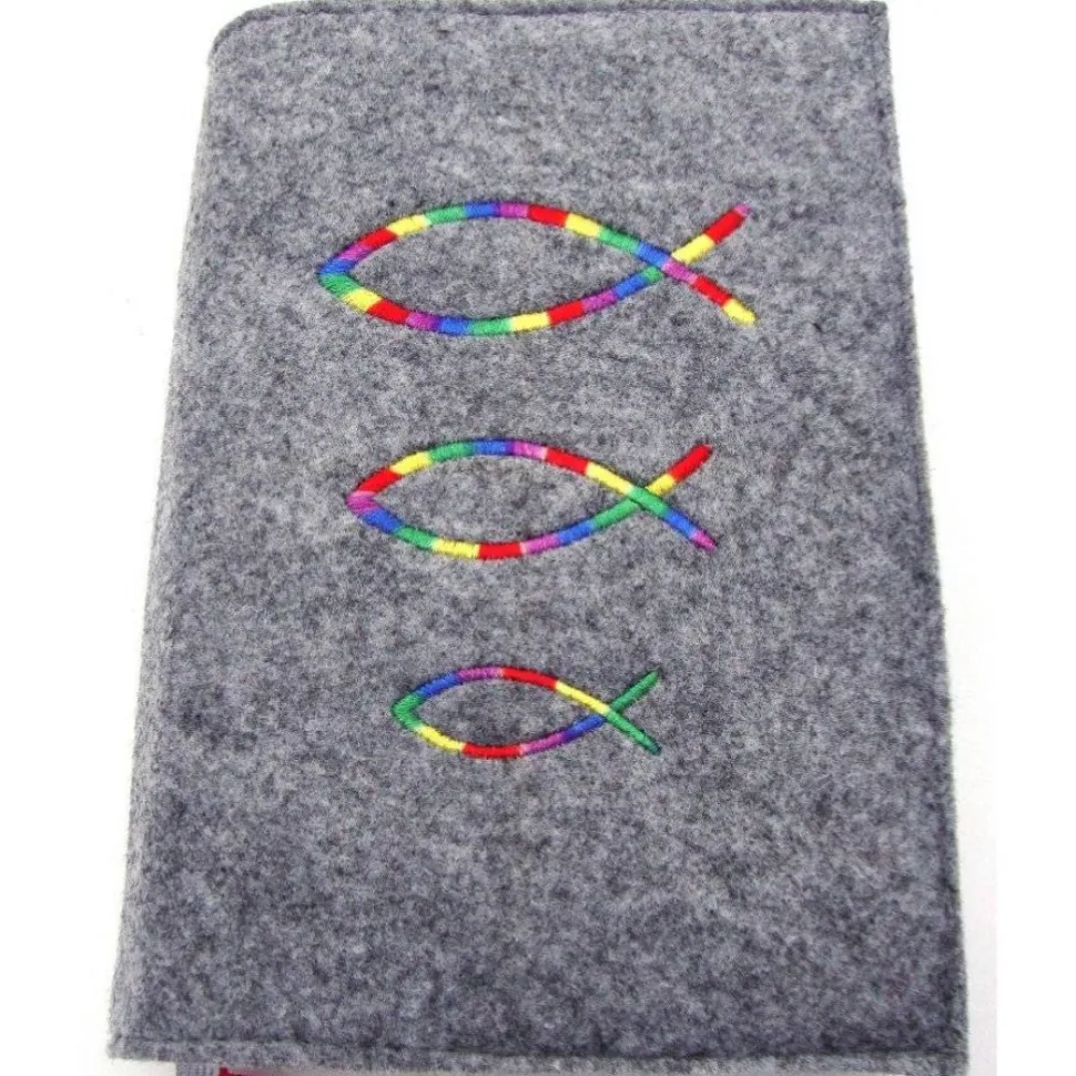 Gotteslobhülle handgefertigt Filz 3mm graumeliert bunte Regenbogenfische personalisierbar Name und Datum bestickt