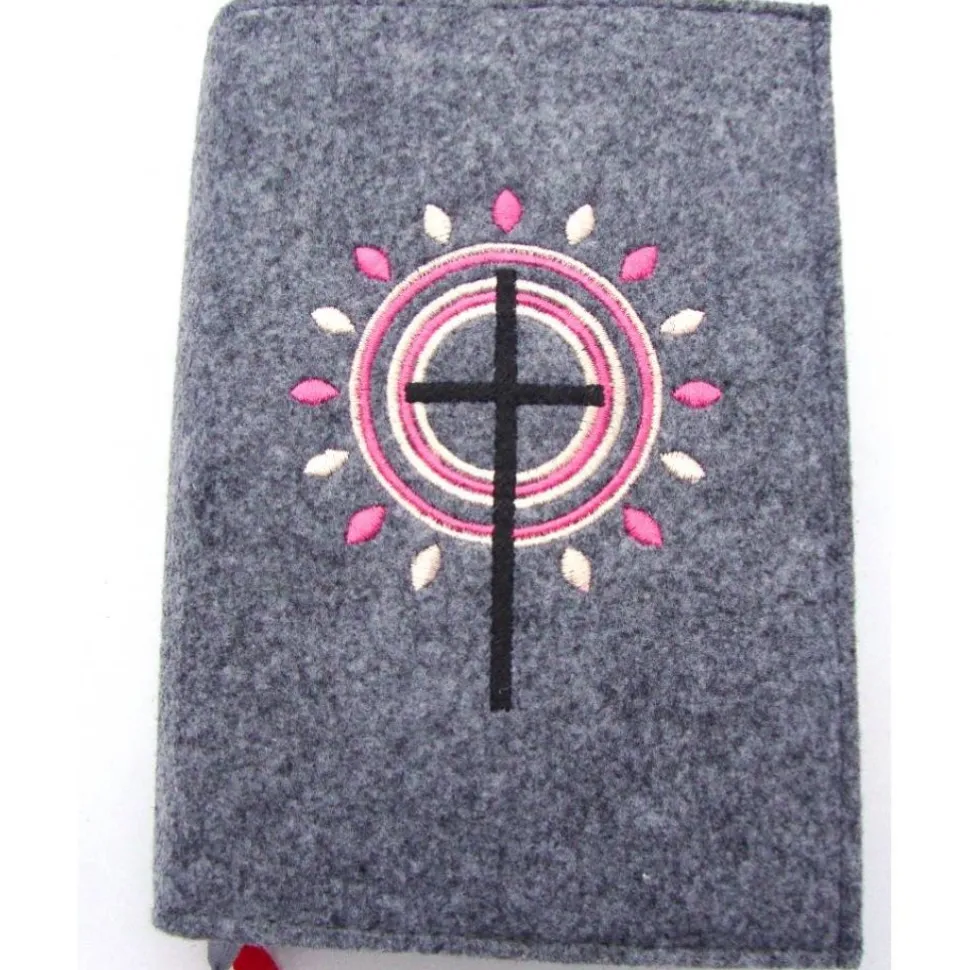 Gotteslobhülle handgefertigt Filz 3mm graumeliert Kreuz Kreise Strahlen rosa personalisierbar Name und Datum bestickt