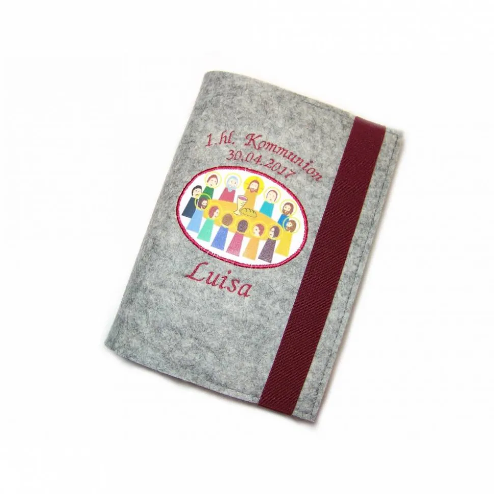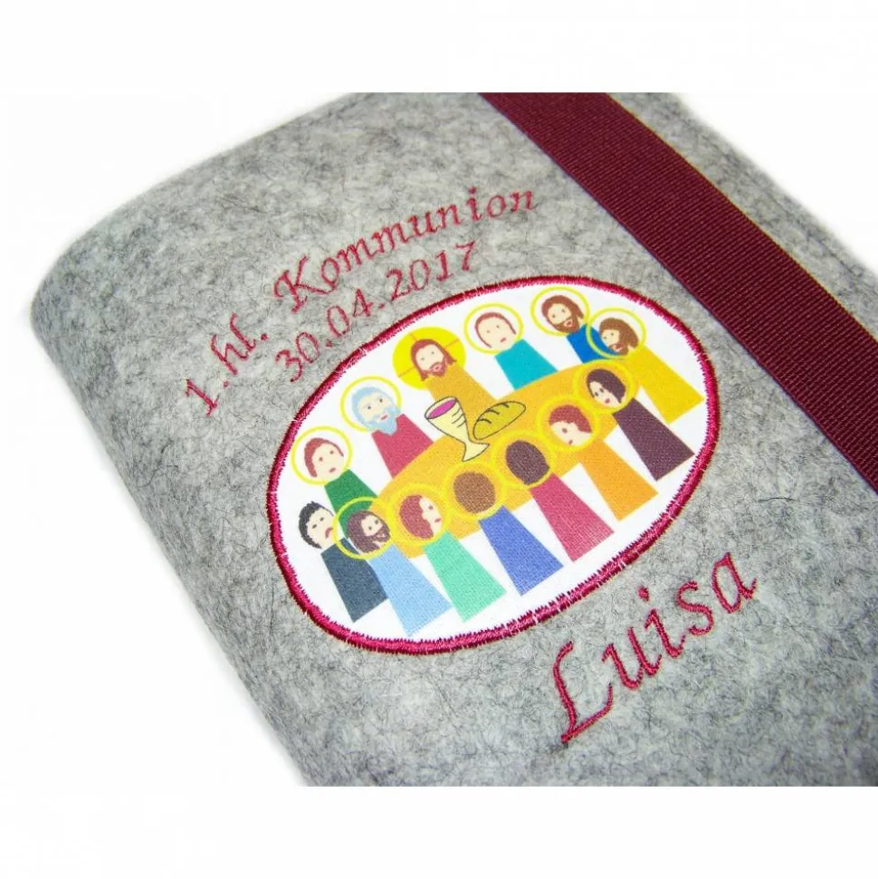 Das Gotteslob wird sich in dieser schicken Gotteslobhülle aus hochwertigem 100% Merino Wollfilz mit selbstentworfenem Abendmahlaufdruck als Aufnäher und passender Stickerei „1.hl. Kommunion“ inkl. individuellem Namen/Datum sicher sehr wohl fühlen 😉